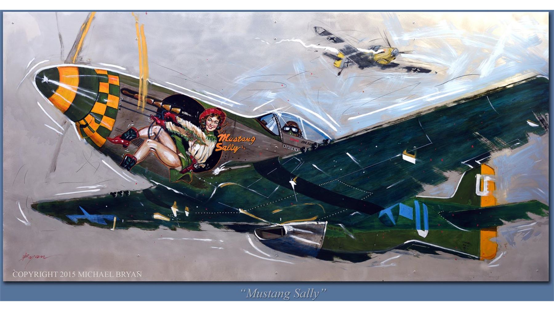 Michael Bryan's pin-up girl WWII fighter is brought to life in "Mustang Sally", a 20x40" Unique hand-worked giclee on canvas numbered 1/1