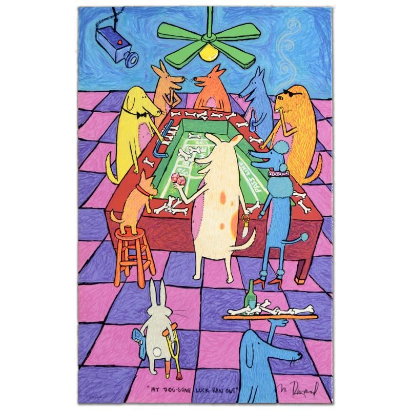 "My Dog Gone Luck Ran Out" is a limited edition hand pulled original lithograph on museum quality deckle-edge paper, numbered and hand signed by Matt Rinard. Includes Certificate of Authenticity! Measures approx. 17.5" x 27.5" (image). This lithograph was created on a rare antique Marinoni Voirin French press that dates back to the 1800's. It provides highly pigmented inks that will resist fading and preserve the integrity of the print for more than a lifetime. This process is the most elaborate, costly and effective way to reproduce art while maintaining the brilliance and accuracy of the original creation.