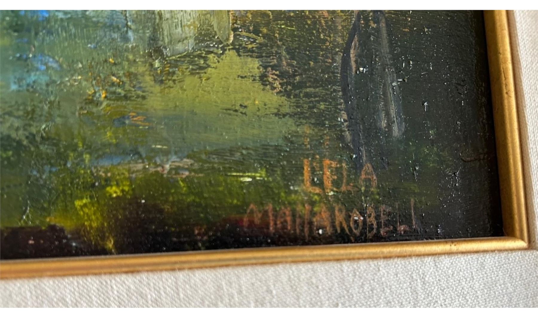 Original oil on found canvas, a charming depiction of her town in native Ukraine, by Lela Maharobelli is 24x29.75. Canvas Shows aging.