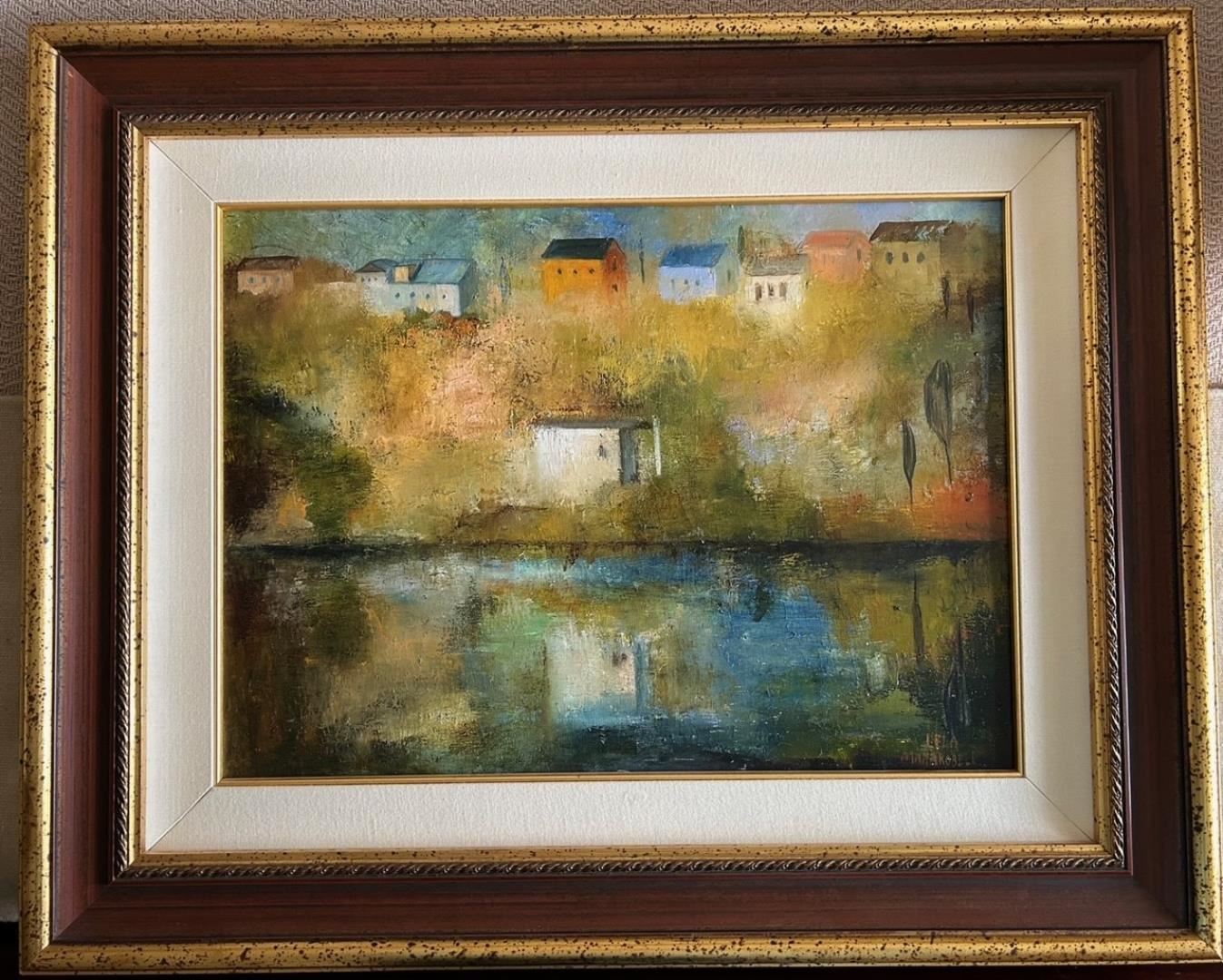Original oil on found canvas, a charming depiction of her town in native Ukraine, by Lela Maharobelli is 24x29.75. Canvas Shows aging.