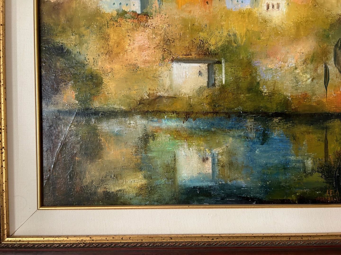 Original oil on found canvas, a charming depiction of her town in native Ukraine, by Lela Maharobelli is 24x29.75. Canvas Shows aging.