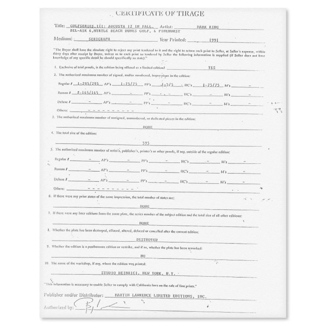 "Myrtle Beach Dunes Golf" is a limited edition serigraph on paper by Mark King (1931-2014). Hand signed and numbered, this piece comes with a letter of authenticity and measures approximately 15" x 20" (image).