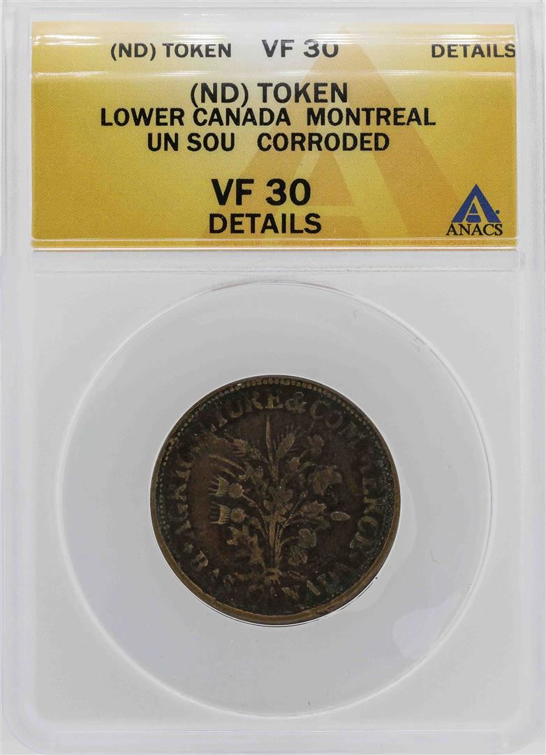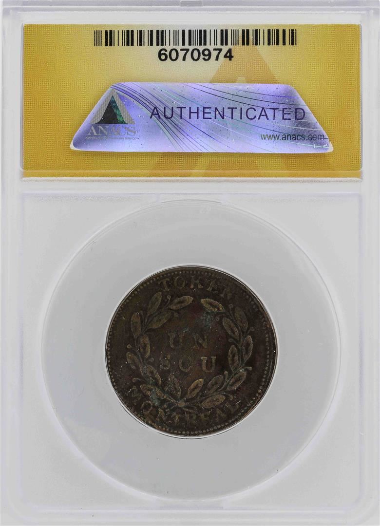 One ND Canada-Montreal Un Sou Coin ANACS VF30 Details. ANACS Appraised.