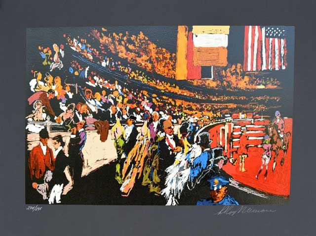 Artist: Leroy Neiman - Title: International Horse Show - Medium: Serigraph on Fine Paper - Signature: Hand-signed by the Artist - Limited Edition: 285 - Image Size: Approximately 17 inches x 25 ½ inches - Paper Size: Approximately 24 inches x 31 ½ inches - Unframed - Details: This work comes with a Certificate of Authenticity - Biography: Over 40 years of unending brilliance in the areas of sport, art and leisure have taken LeRoy Neiman to the pinnacle of artistic fame. His primary training in the field was at the re-known Chicago Art Institute Working commercially, he met a young ad man starting a new and revolutionary "art" publication that was to have a profound effect on his professional life. - The man was Hugh Hefner; the publication, Playboy magazine. For four decades LeRoy has graced those pages with his spot and leisure panels. LeRoy works in a patented impressionistic style that gives life to action and movement. His panels explode with brilliant color and ambient energy. He is, perhaps, the most easily recognizable artist alive today. His large "coffee table" compendium books are very popular and a joy to view and read. His body of work is enormous and still growing today. - Neiman's originals have sold for more than $300,000.00.<BR