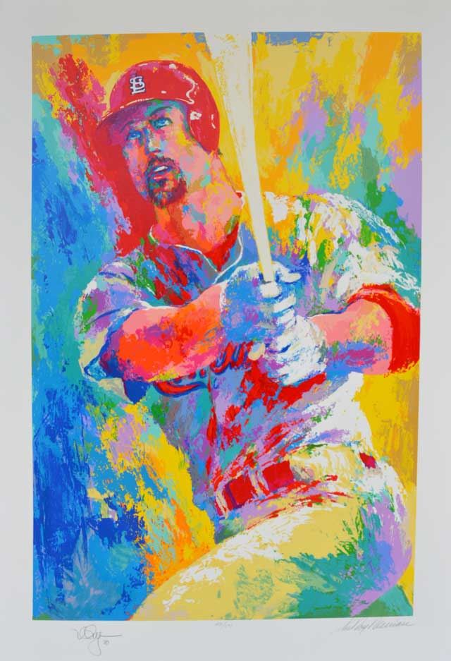 Artist: Leroy Neiman - Title: Mark McGwire - Medium: Serigraph on Fine Paper - Signature: Hand-signed by the Artist - Limited Edition: 509 - Image Size: Approximately 40 inches x 26 ½ inches - Paper Size: Approximately 47 inches x 32 ½ inches - Unframed - Details: This work comes with a Certificate of Authenticity - Biography: Over 40 years of unending brilliance in the areas of sport, art and leisure have taken LeRoy Neiman to the pinnacle of artistic fame. His primary training in the field was at the re-known Chicago Art Institute Working commercially, he met a young ad man starting a new and revolutionary "art" publication that was to have a profound effect on his professional life. - The man was Hugh Hefner; the publication, Playboy magazine. For four decades LeRoy has graced those pages with his spot and leisure panels. LeRoy works in a patented impressionistic style that gives life to action and movement. His panels explode with brilliant color and ambient energy. He is, perhaps, the most easily recognizable artist alive today. His large "coffee table" compendium books are very popular and a joy to view and read. His body of work is enormous and still growing today. - Neiman's originals have sold for more than $300,000.00. -