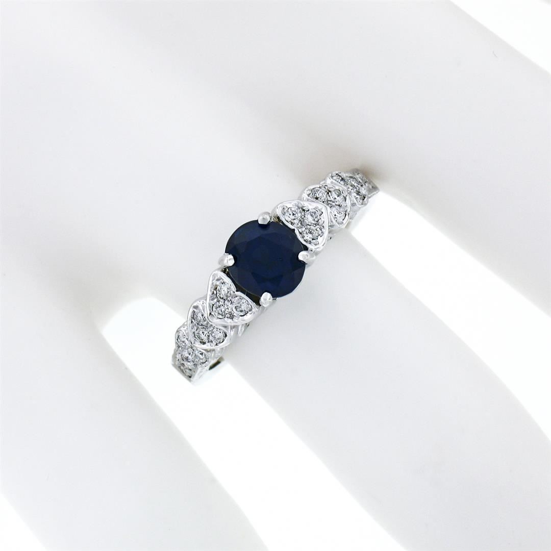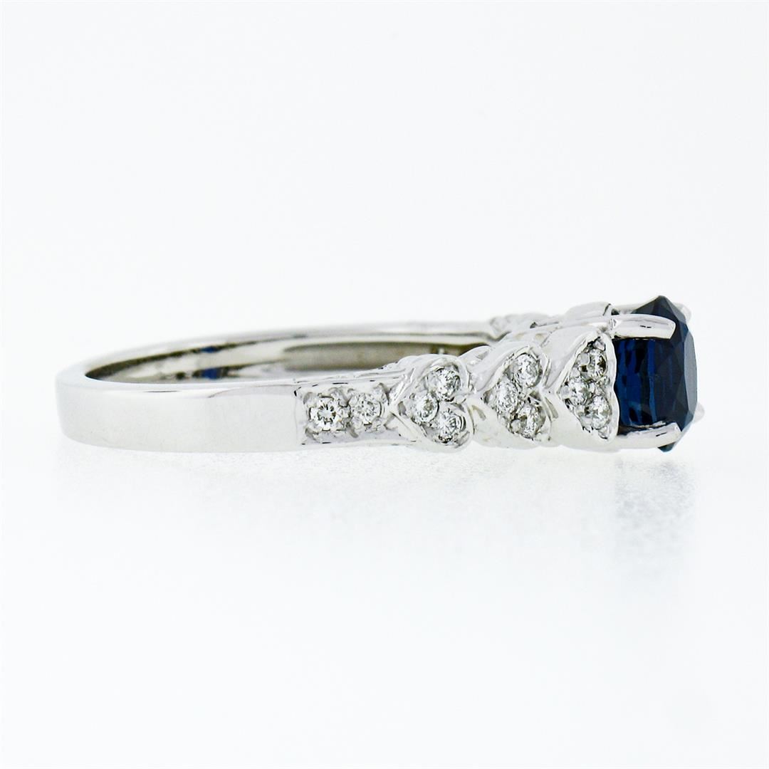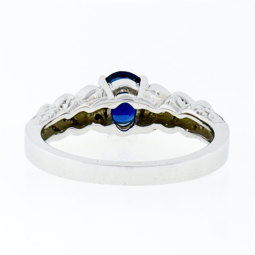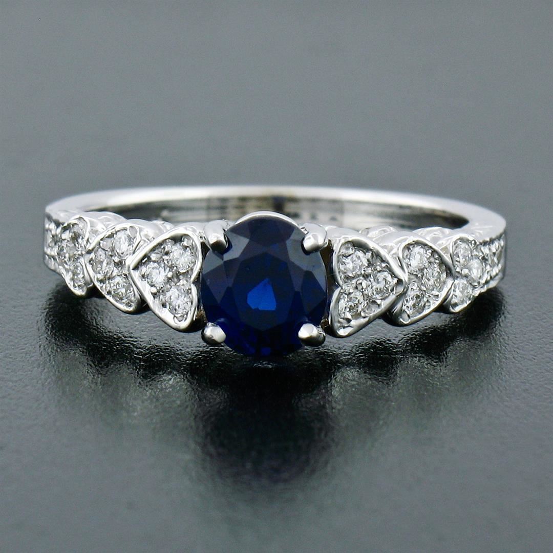 A new solid 14k white gold solitaire ring, with 1 GIA certified oval brilliant cut natural sapphire (1.14ct), and 22 round brilliant cut natural diamonds (F/G - VS1/VS2 ; 0.22ctw). The ring is size 6.5, weighs a total of 4.71 grams, and measures 6.1mm wide. Comes with all original relevant certifications.