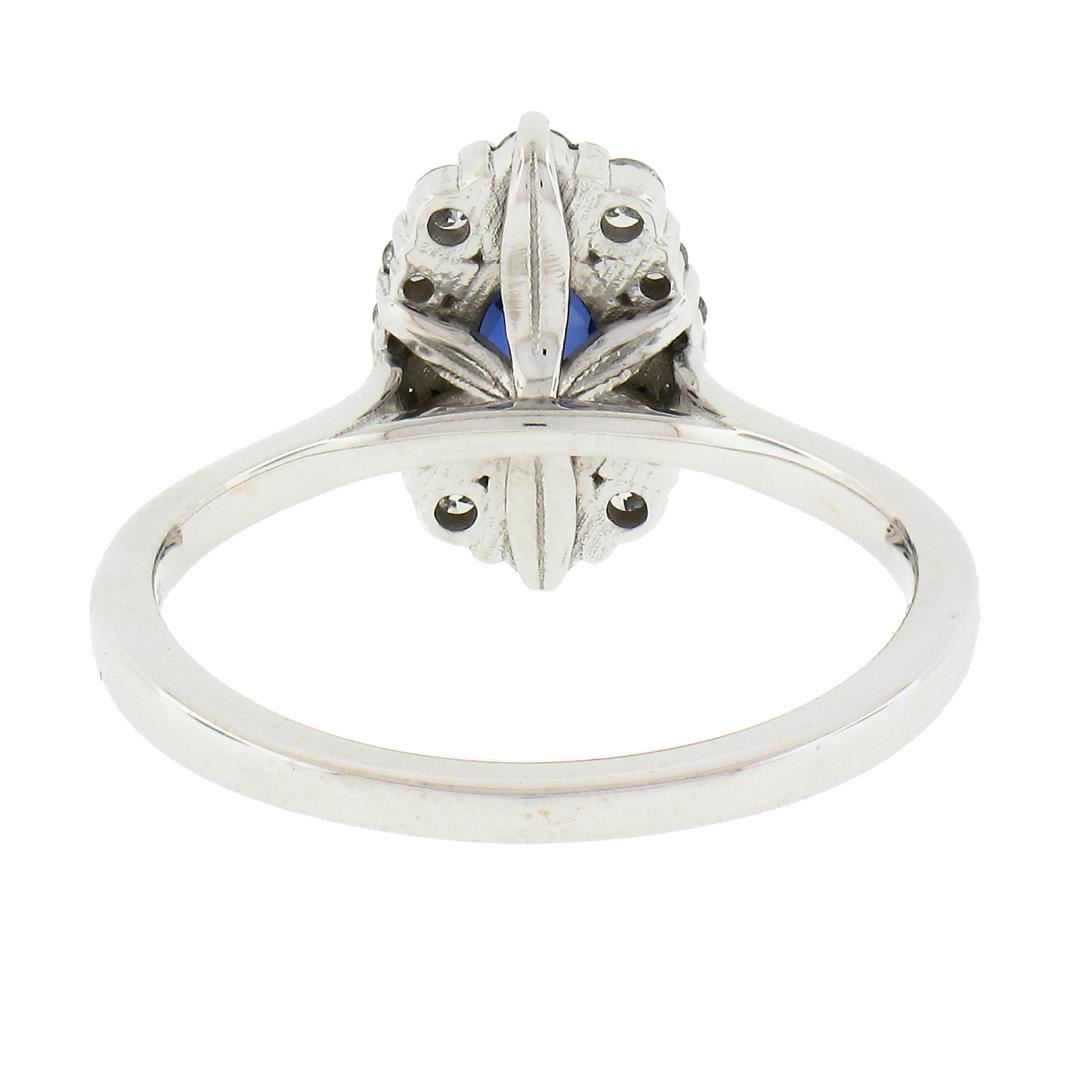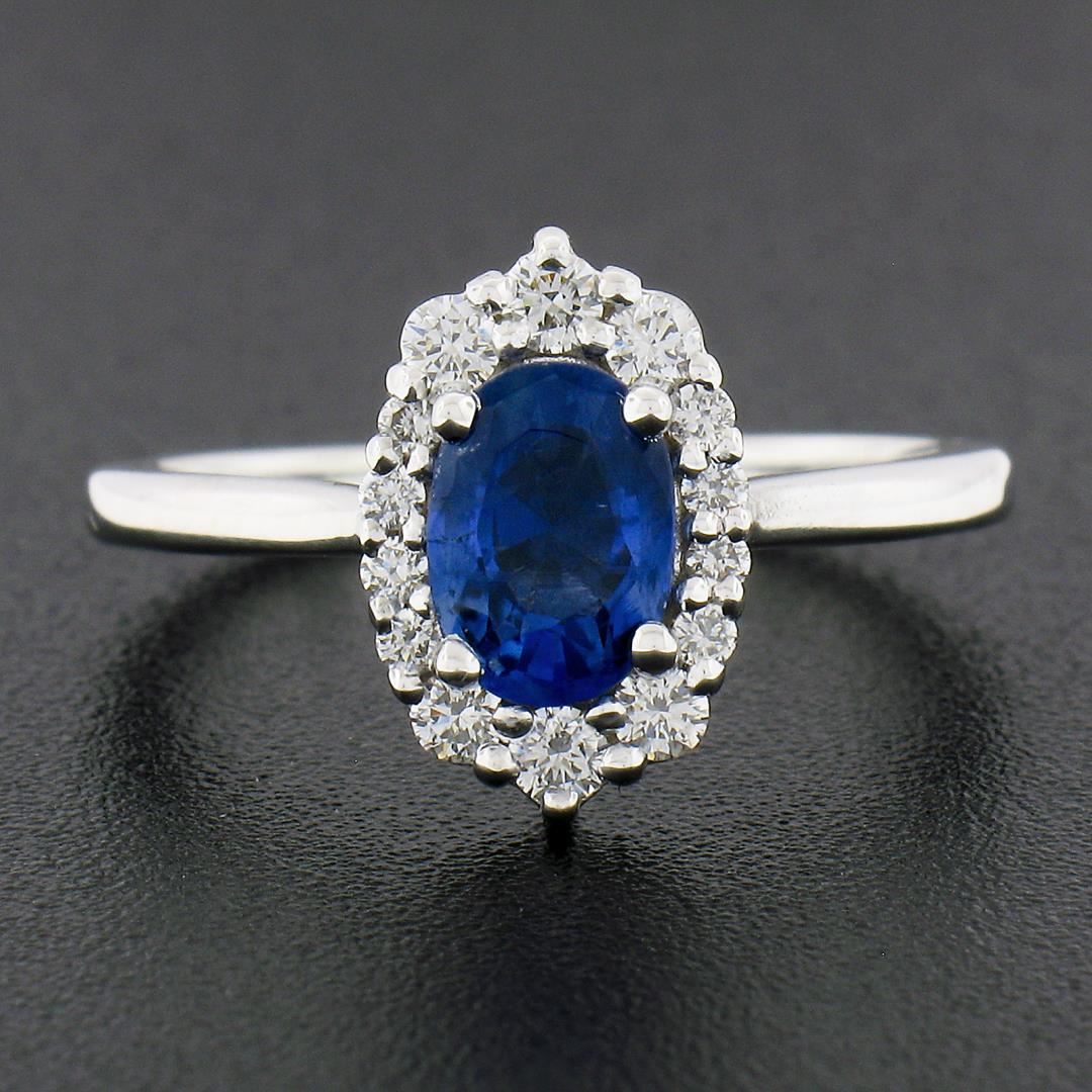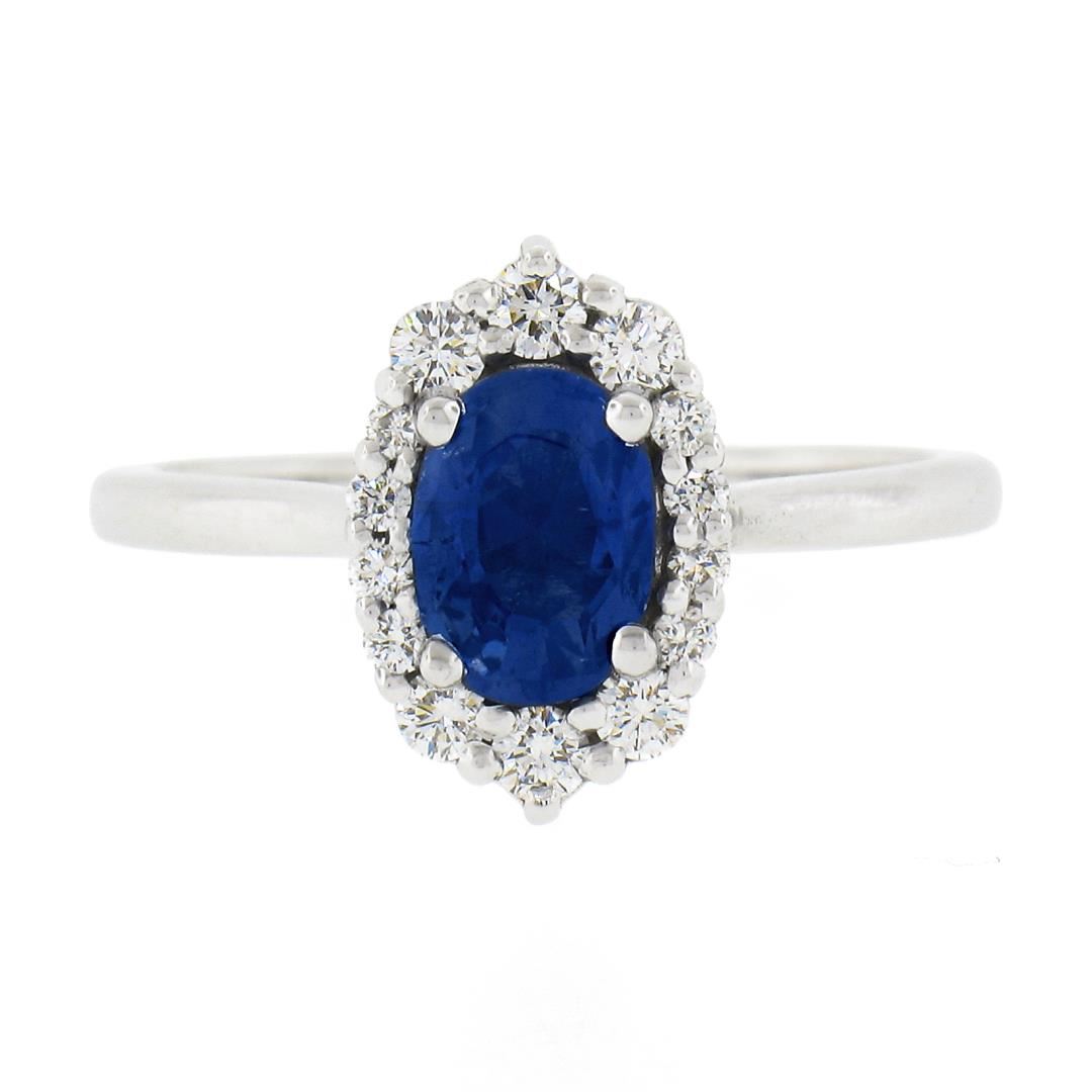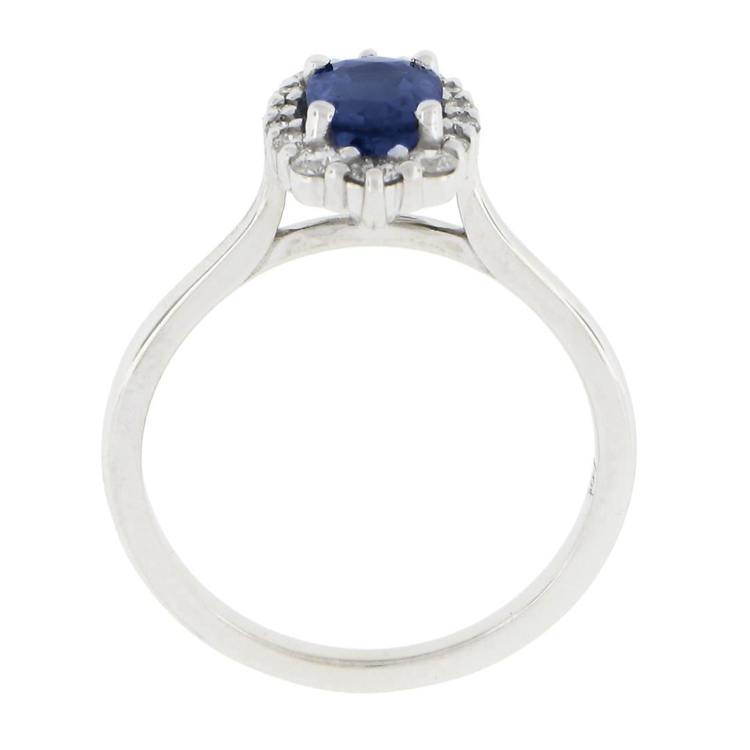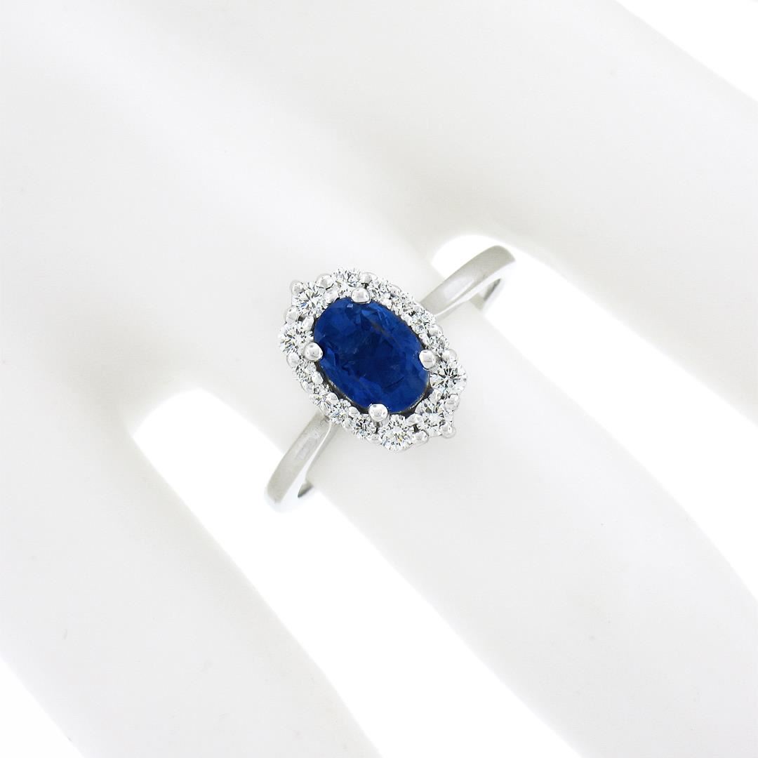 A new solid 14k white gold ring, with 1 GIA graded oval cut sapphire (1.28ct ), and a halo of 14 round cut natural diamonds (G/H - VS1/VS2 ; 0.30ctw). The ring is size 6.5, weighs a total of 3.16 grams, and measures 12.2mm wide. Comes with all original relevant certifications.