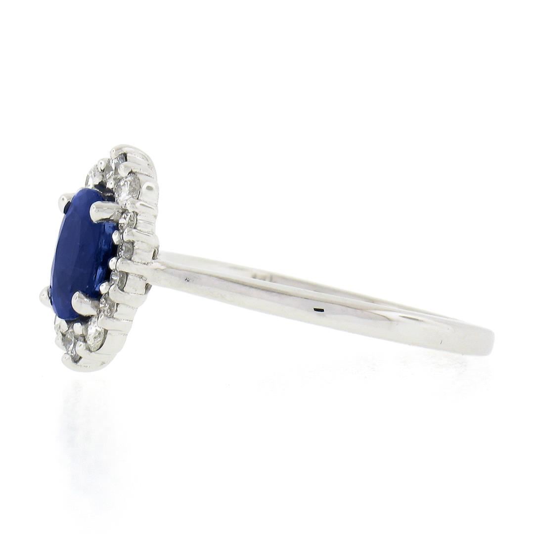 A new solid 14k white gold ring, with 1 GIA graded oval cut sapphire (1.28ct ), and a halo of 14 round cut natural diamonds (G/H - VS1/VS2 ; 0.30ctw). The ring is size 6.5, weighs a total of 3.16 grams, and measures 12.2mm wide. Comes with all original relevant certifications.