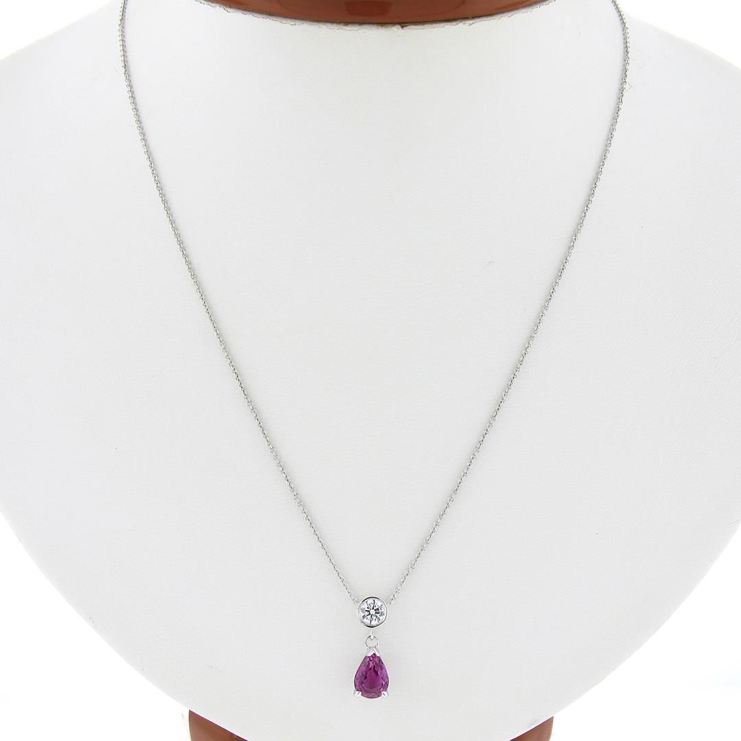 A new solid 14k white gols pendant necklace, with 1 pear cut natural pink sapphire (1.52ct), and 1 round cut natural diamond (G - VS2 ; 0.47ct). Adjsutable 16 & 18 inch cable link chain, 2.50 grams total weight, pendant measures 16.90x6mm.