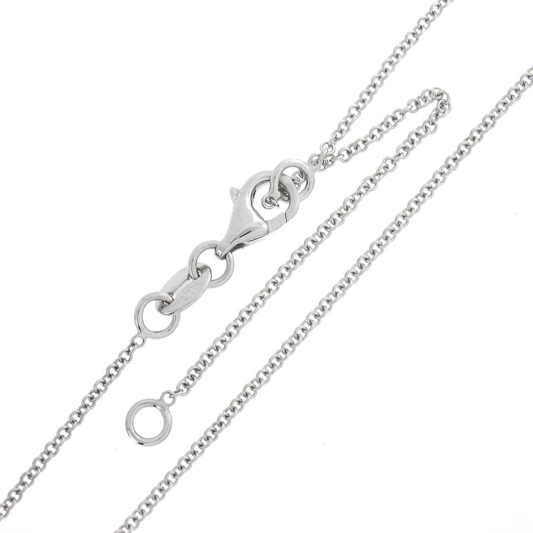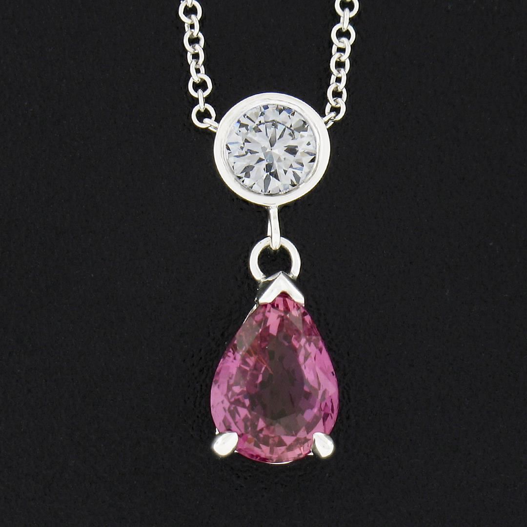 A new solid 14k white gols pendant necklace, with 1 pear cut natural pink sapphire (1.52ct), and 1 round cut natural diamond (G - VS2 ; 0.47ct). Adjsutable 16 & 18 inch cable link chain, 2.50 grams total weight, pendant measures 16.90x6mm.