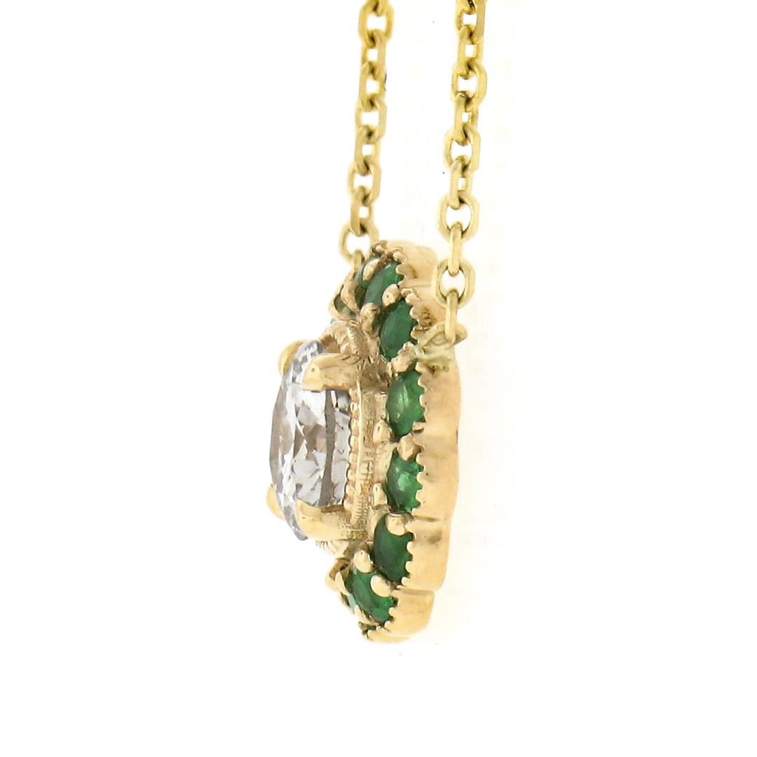 A new solid 14k yellow gold pendant necklace, with 1 round brilliant cut natural diamond (H - VS2 ; 0.52ct), and 13 round brilliant cut natural emeralds (0.20ctw). Adjustable to 16 & 18 inch cable link chain, 3.15 grams total weight, pendant measures 10.65mm in diameter.