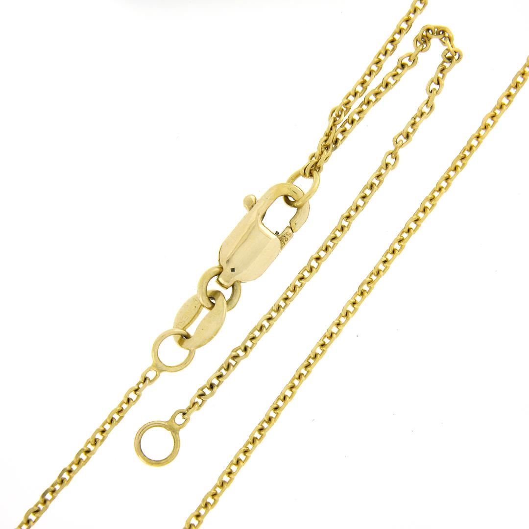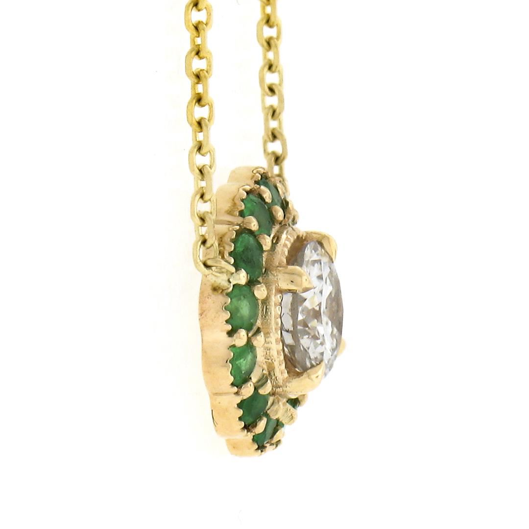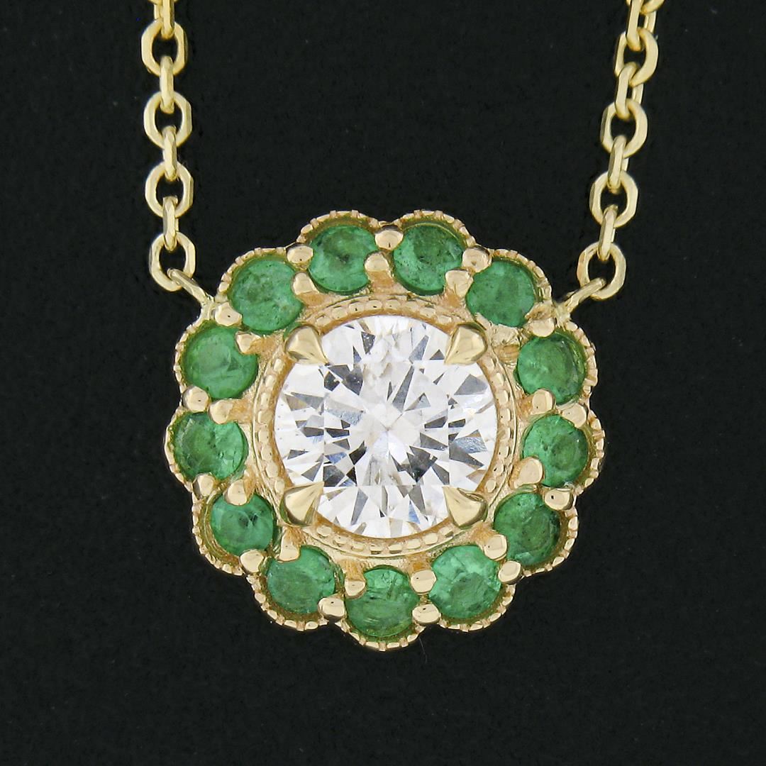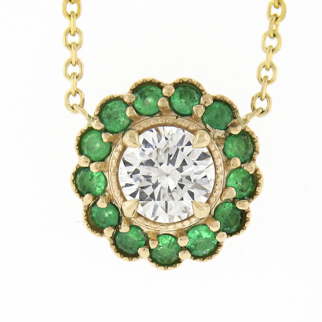 A new solid 14k yellow gold pendant necklace, with 1 round brilliant cut natural diamond (H - VS2 ; 0.52ct), and 13 round brilliant cut natural emeralds (0.20ctw). Adjustable to 16 & 18 inch cable link chain, 3.15 grams total weight, pendant measures 10.65mm in diameter.