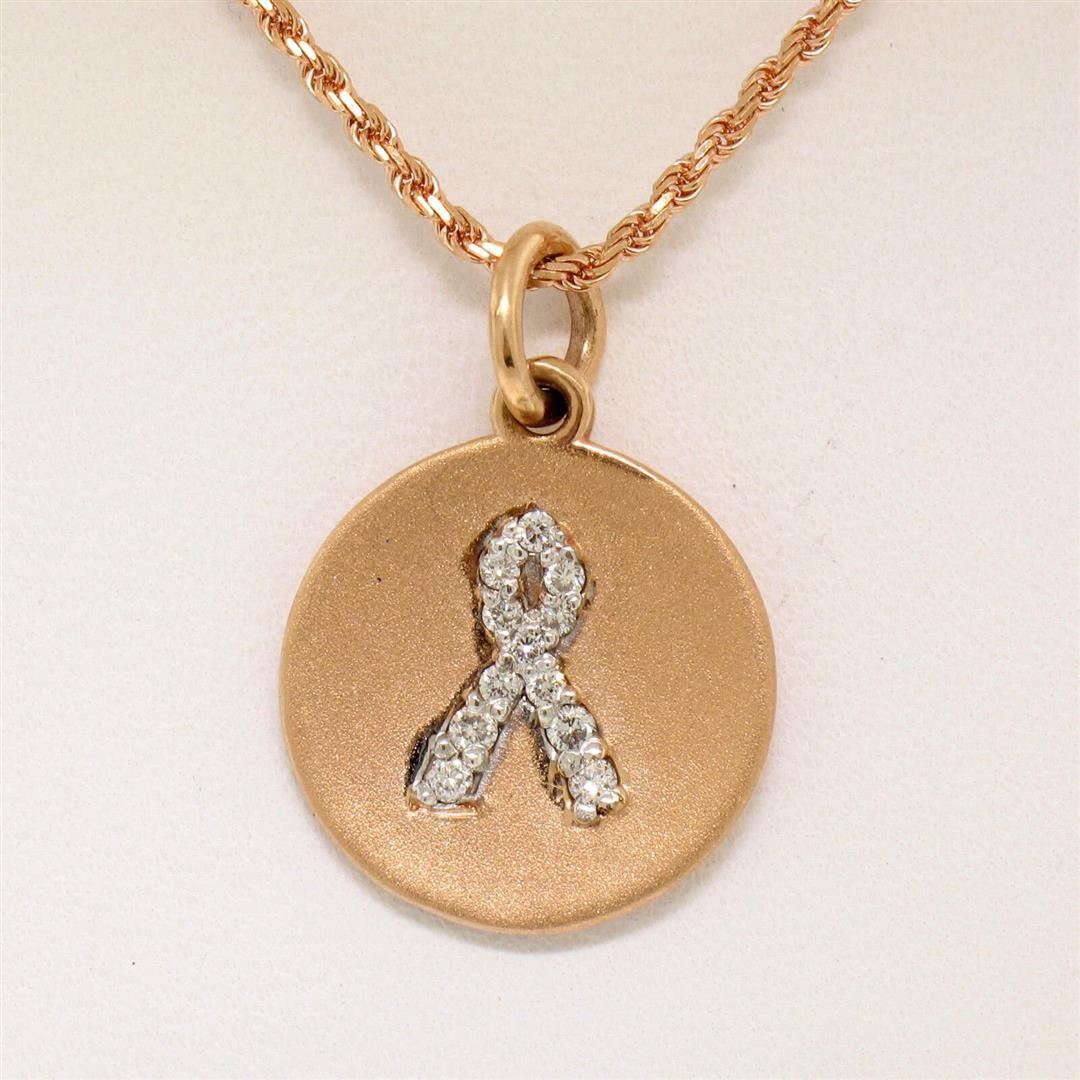 A new solid 14k rose gold pendant necklace, with 12 round brilliant cut natural diamons (G/H - SI1; 0.10ctw). 16 inch rope link chain, 5.1 grams total weight, pendant measures 21x14.8mm.