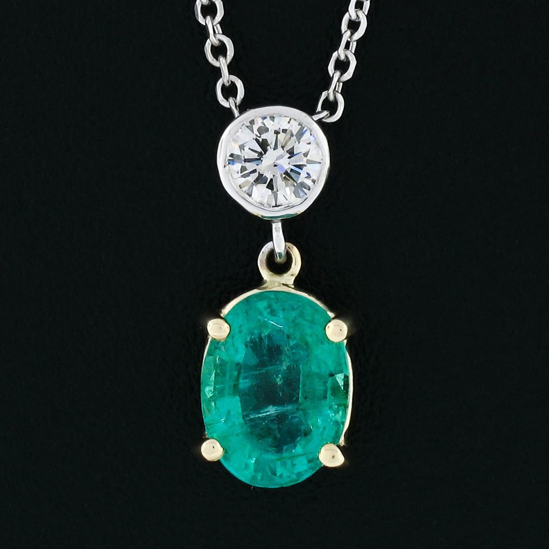 A new solid 14k yellow & white gold pendant necklace, with 1 oval brilliant cut natural emerald (1.22ct ), and 1 round brilliant cut natural diamond (H - VS2 ; 0.22ct). The pendant weighs a total of 2.80 grams, measures 15.30x6.70mm including the bail, and adjustable to 16 or 18 inch cable link chain.