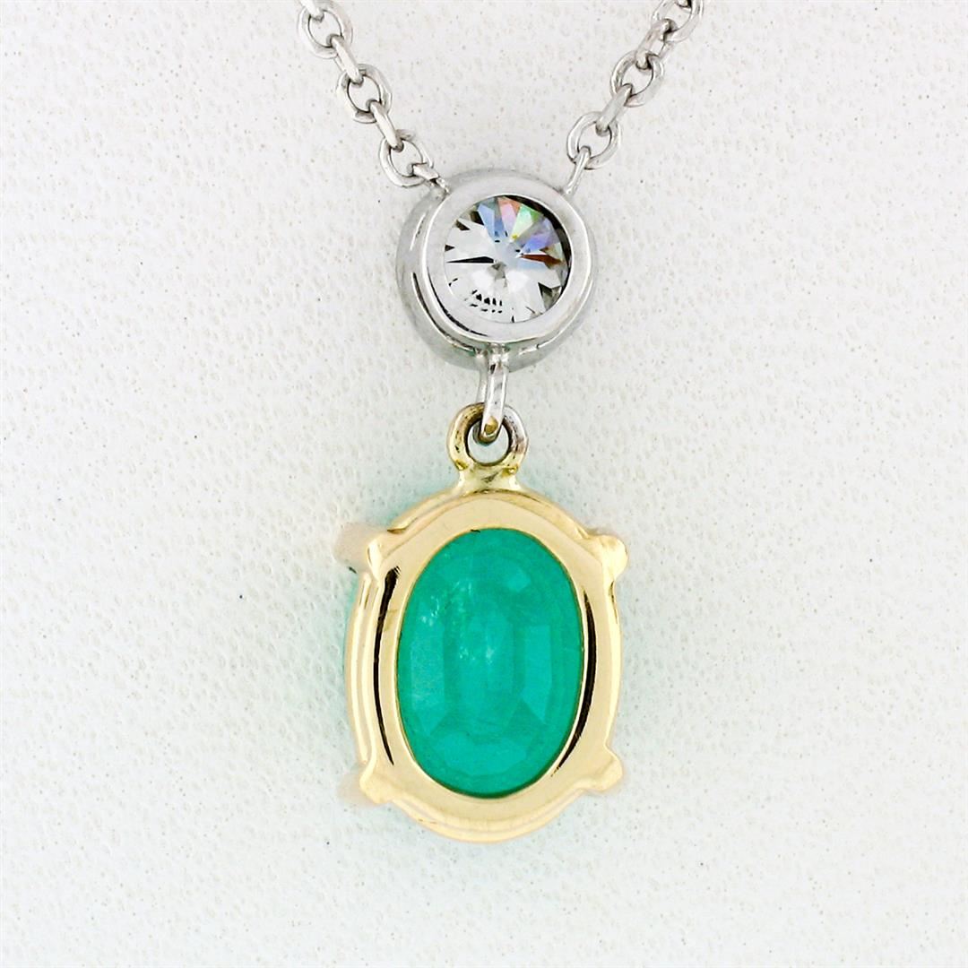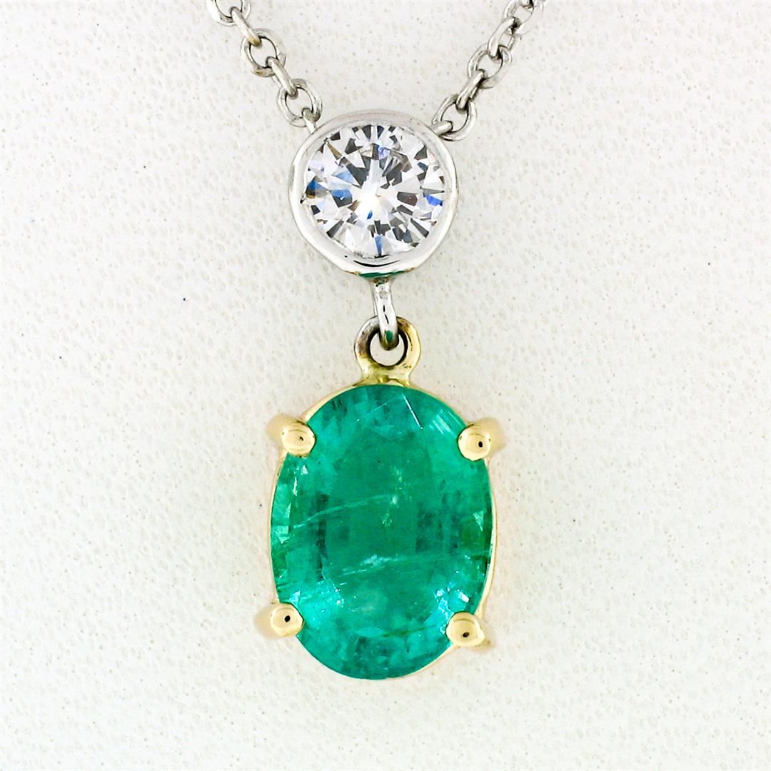 A new solid 14k yellow & white gold pendant necklace, with 1 oval brilliant cut natural emerald (1.22ct ), and 1 round brilliant cut natural diamond (H - VS2 ; 0.22ct). The pendant weighs a total of 2.80 grams, measures 15.30x6.70mm including the bail, and adjustable to 16 or 18 inch cable link chain.
