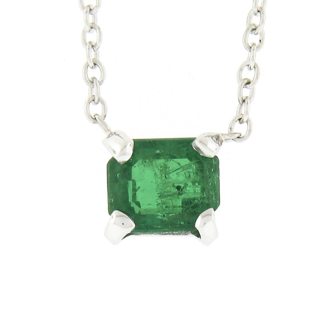 A new solid 14k white gold pendant necklace, with 1 emerald cut natural emerald (0.42 ct). Adjustable at 16 or 18 inch cable link chain, 1.72 grams total weight, pendant measures 5x5.4mm.