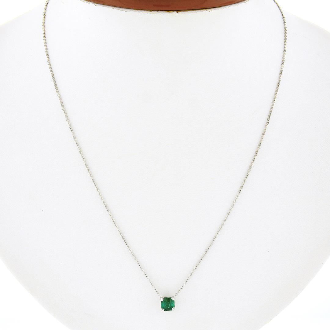 A new solid 14k white gold pendant necklace, with 1 emerald cut natural emerald (0.42ct). Adjustable at 16 or 18 inch cable link chain, 1.71 grams total weight, pendant measures 5.1x5.2mm.