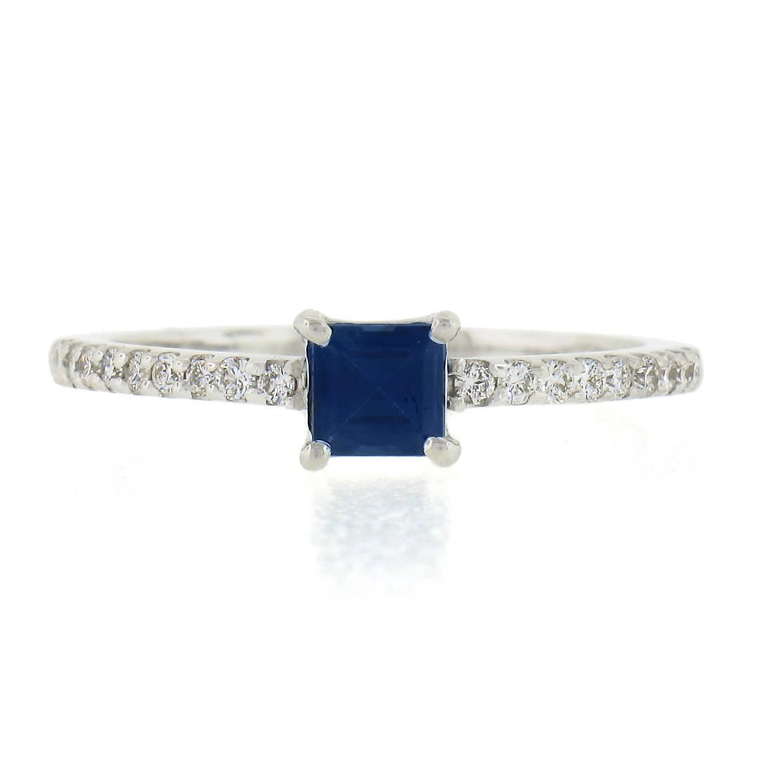 A new solid 14 white gold ring, with 1 square cut natural sapphire (0.41ct), and 18 round cut natural diamonds (F/G - VS1-VS2 ; 0.18ctw). The ring is size 7.5, weighs a total of 1.93 grams, and measures 5.1mm wide.