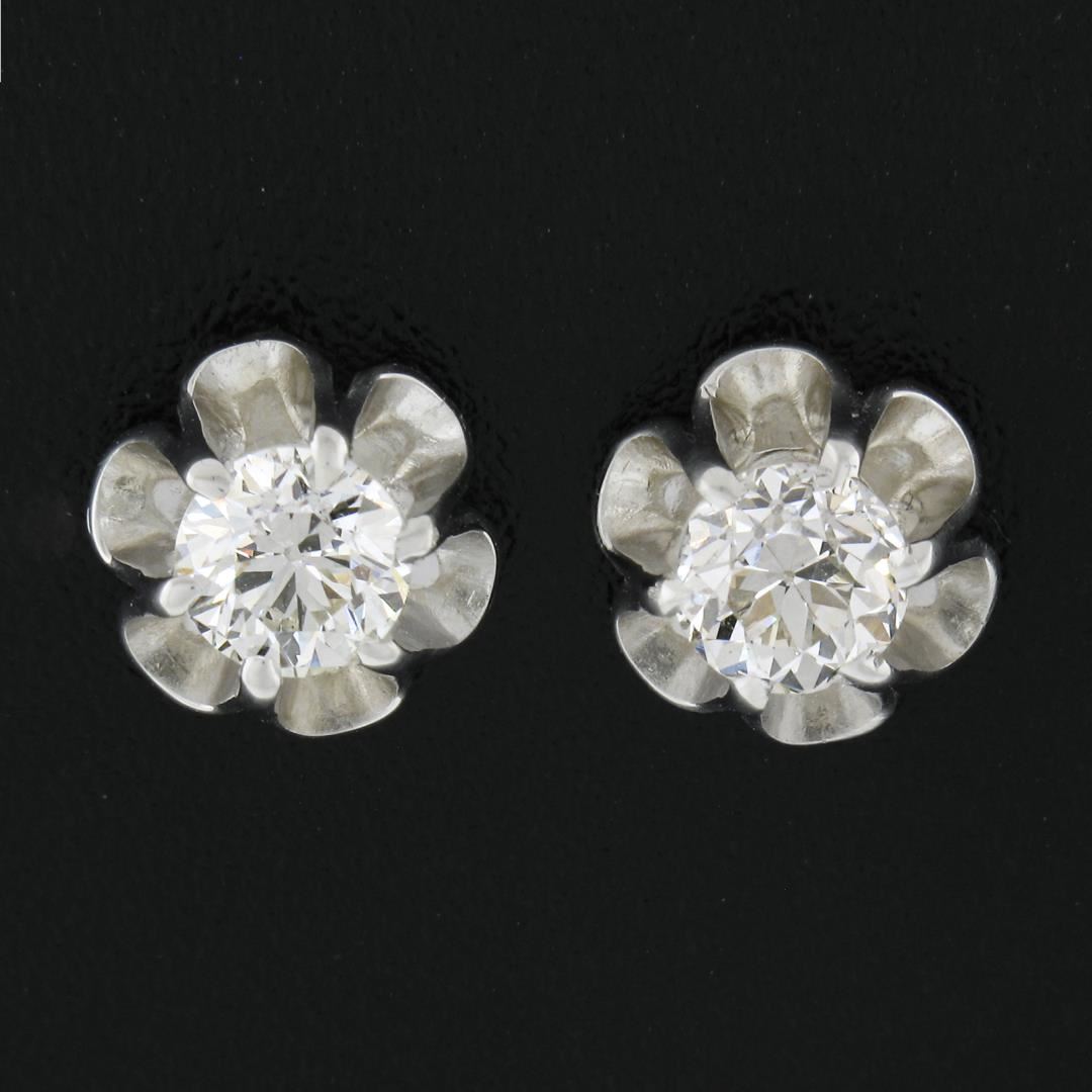 A new solid 14k white gold flower stud earrings, with 2 old european cut natural diamonds (H/I - VS2/SI1 ; 0.76ctw). The earrings measure approximately 7.9mm in diameter and weigh a total of 1.56 grams.