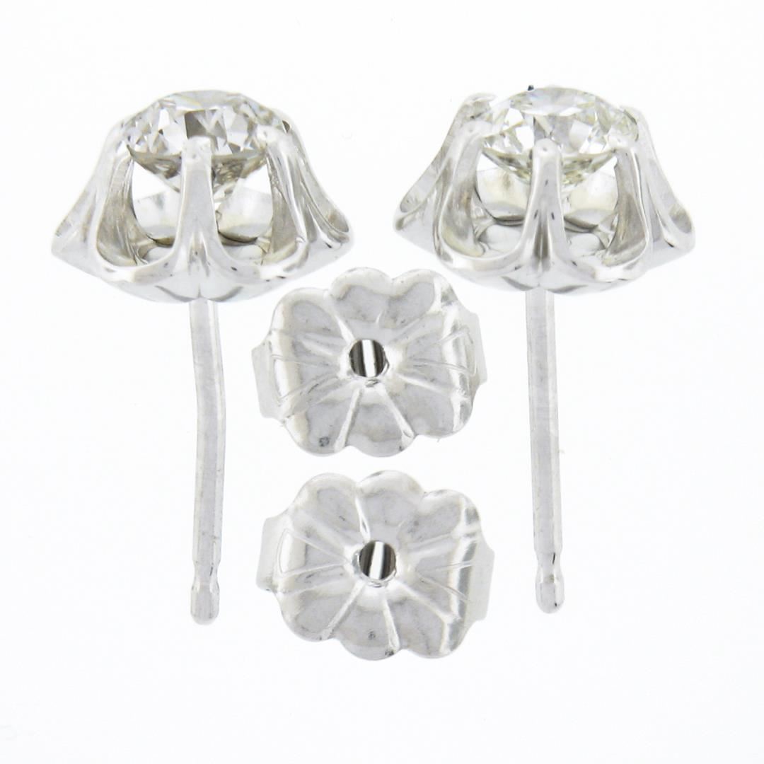 A new solid 14k white gold flower stud earrings, with 2 old european cut natural diamonds (H/I - VS2/SI1 ; 0.76ctw). The earrings measure approximately 7.9mm in diameter and weigh a total of 1.56 grams.