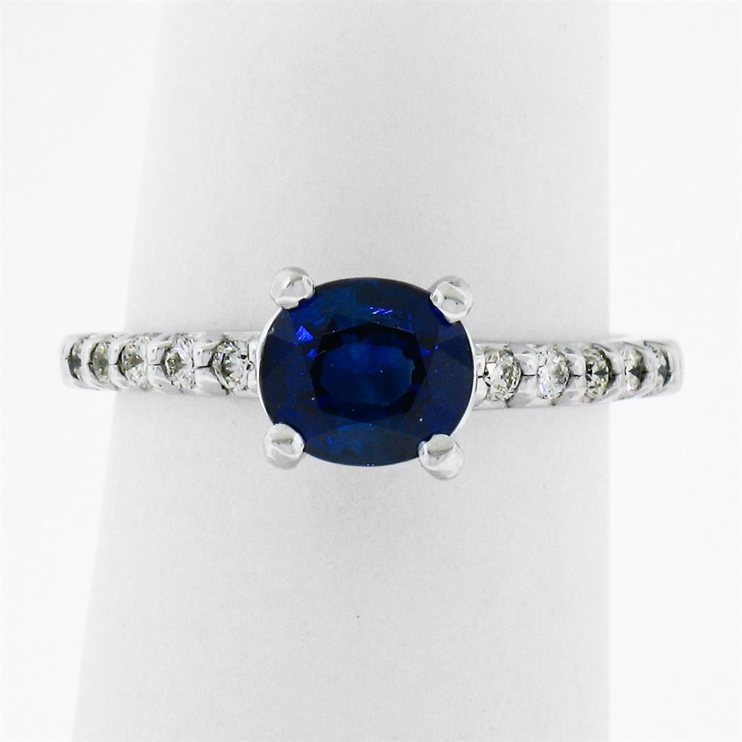 A new solid 14k white gold solitaire engagement ring, with 1 Gia certified oval cut naural sapphire (6.46 x 5.70 x 3.51 mm- 1.15ct), and 10 round brilliant cut natural diamonds (G/H - VS1/VS2; 0.15ctw). The ring is size 5.0, weighs a total of 2.46 grams, and measures 6.15mm wide. Comes with all original relevant certifications.