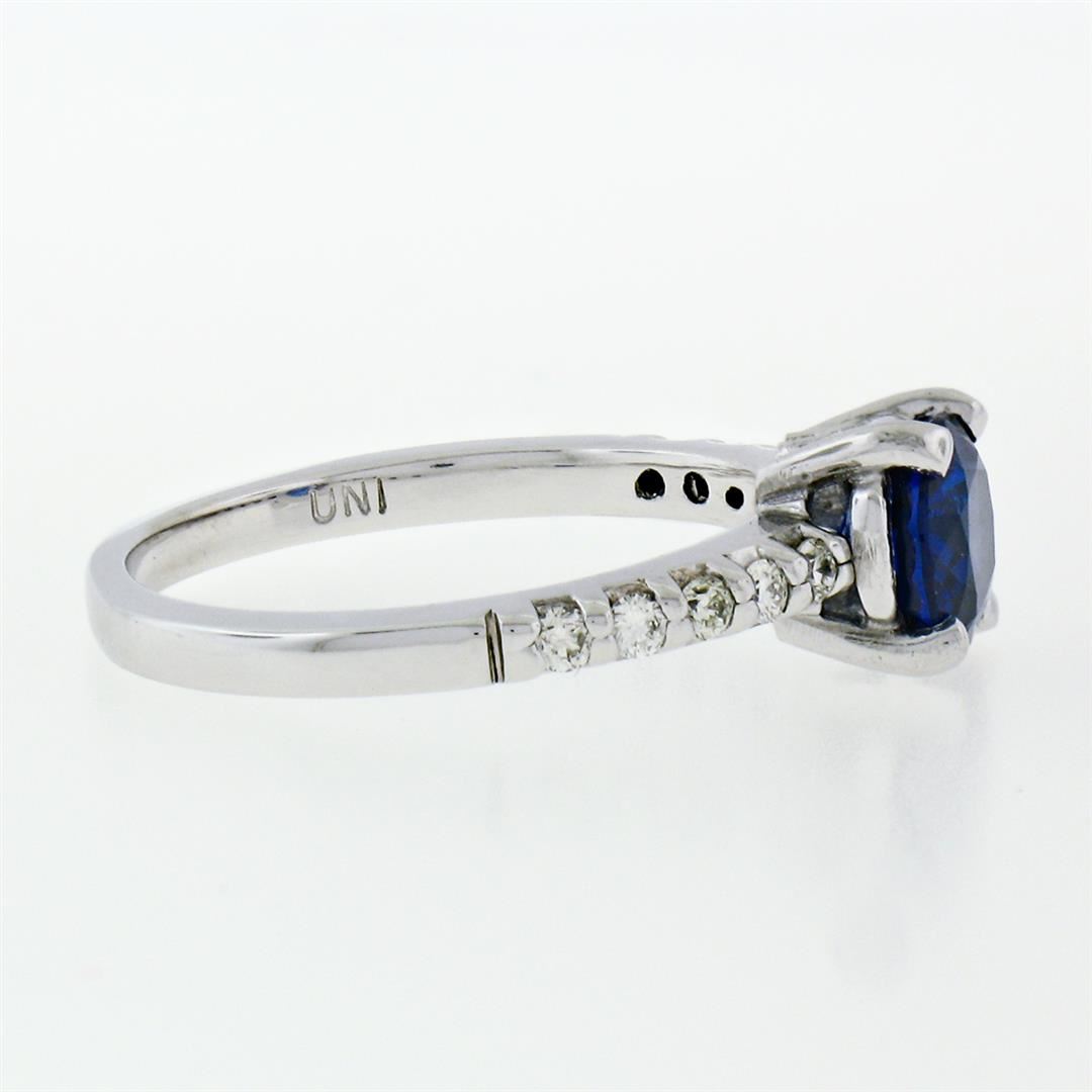 A new solid 14k white gold solitaire engagement ring, with 1 Gia certified oval cut naural sapphire (6.46 x 5.70 x 3.51 mm- 1.15ct), and 10 round brilliant cut natural diamonds (G/H - VS1/VS2; 0.15ctw). The ring is size 5.0, weighs a total of 2.46 grams, and measures 6.15mm wide. Comes with all original relevant certifications.