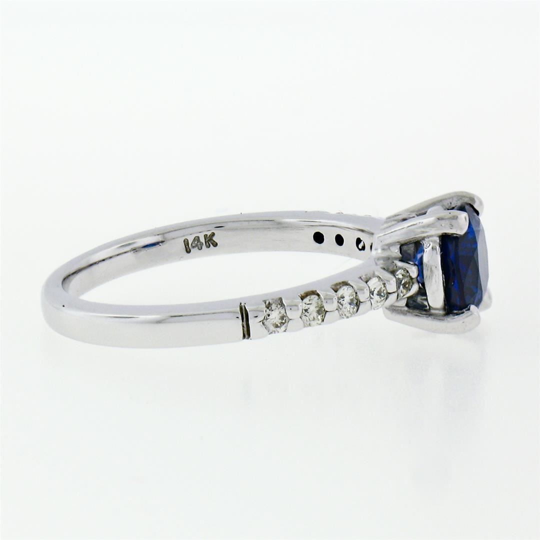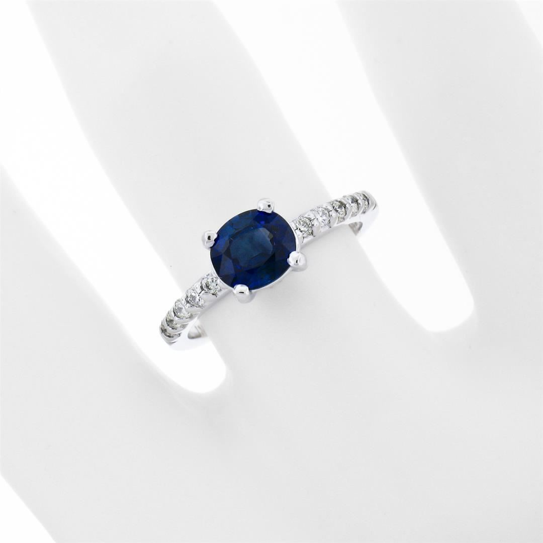 A new solid 14k white gold solitaire engagement ring, with 1 Gia certified oval cut naural sapphire (6.46 x 5.70 x 3.51 mm- 1.15ct), and 10 round brilliant cut natural diamonds (G/H - VS1/VS2; 0.15ctw). The ring is size 5.0, weighs a total of 2.46 grams, and measures 6.15mm wide. Comes with all original relevant certifications.