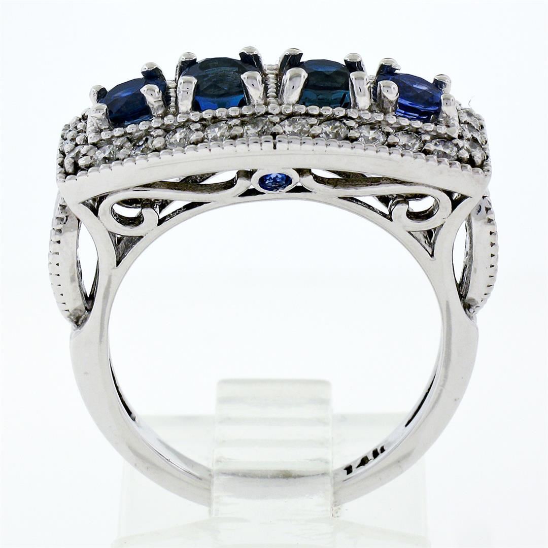 A new Solid 14k white gold milgrain band ring, featuring 6 round brilliant cut natural sapphires (1.32ctw), surrounded with 30 round brilliant cut natural diamonds ( F/G - VS1/VS2; 0.75ctw). The ring is size 6.5, weighs a total of 6.05 grams, and measures 9.90mm wide.