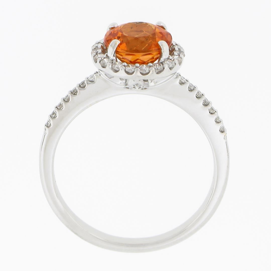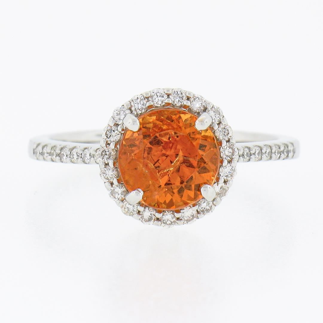 A new solid 14k white gold ring, with 1 round brilliant cut natural spessartite garnet (2.06ct), and a halo of 33 round brilliant cut natural diamonds (G/H - SI1/SI2 ; 0.27ctw). The ring is size 6.5, weighs a total of 3.05 grams, and measures 9.85mm wide.