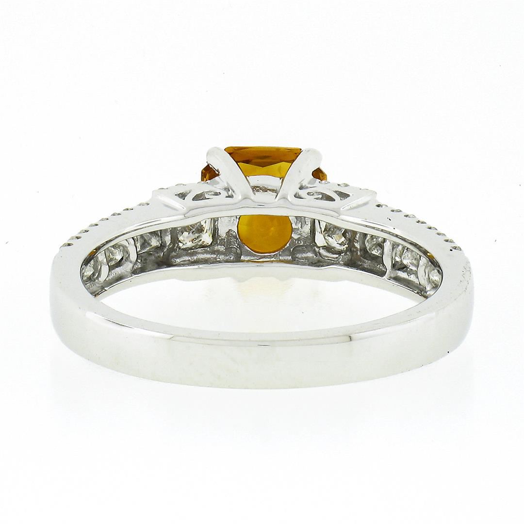 A new solid 14k white gold engagement ring, with 1 Gia certified octagonal cur natural orange sapphire (1.67ct ), and 14 princess cut natural diamonds (G/H - VS2/SI1 ; 0.50ctw), with 48 round brilliant cut natural diamonds (G/H - VS2/SI1 ; 0.50ctw). The