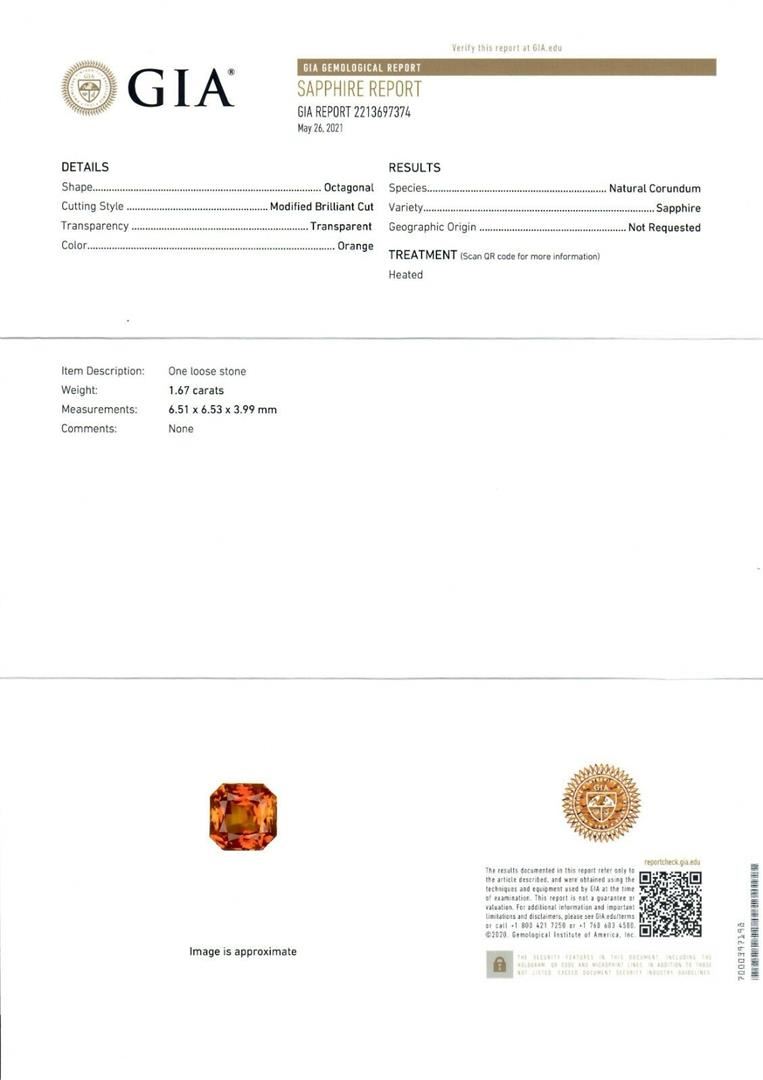 A new solid 14k white gold engagement ring, with 1 Gia certified octagonal cur natural orange sapphire (1.67ct ), and 14 princess cut natural diamonds (G/H - VS2/SI1 ; 0.50ctw), with 48 round brilliant cut natural diamonds (G/H - VS2/SI1 ; 0.50ctw). The ring is size 7.0, weighs a total of 3.84 grams, and measures 6.60mm wide. Comes with all original relevant certifications.