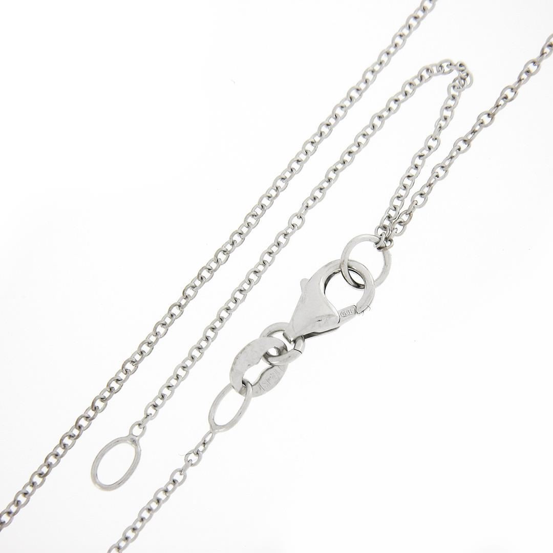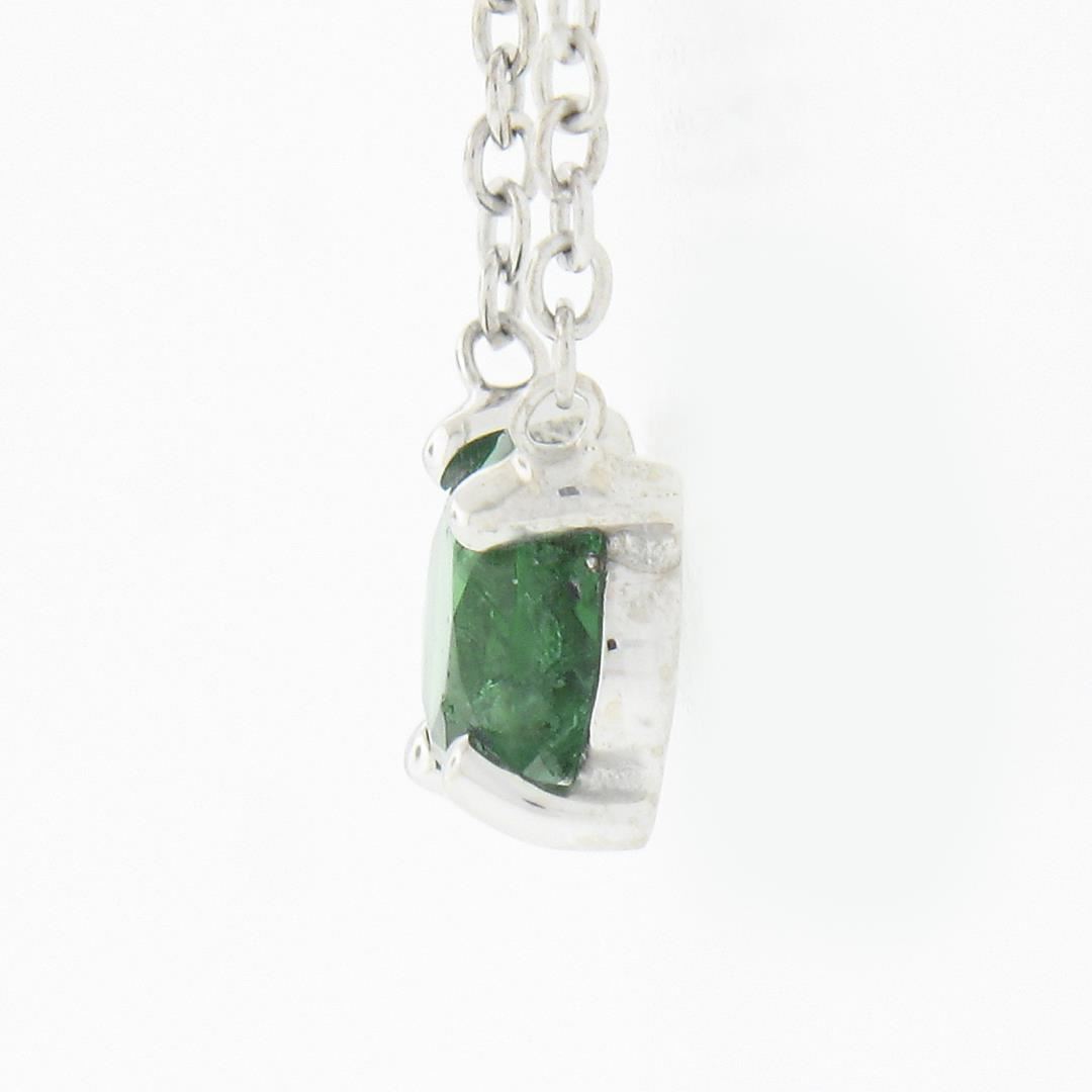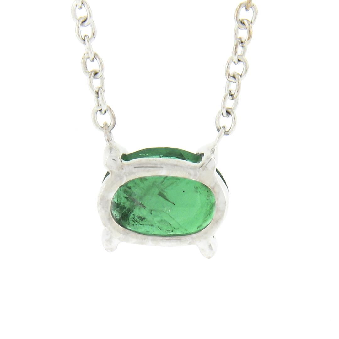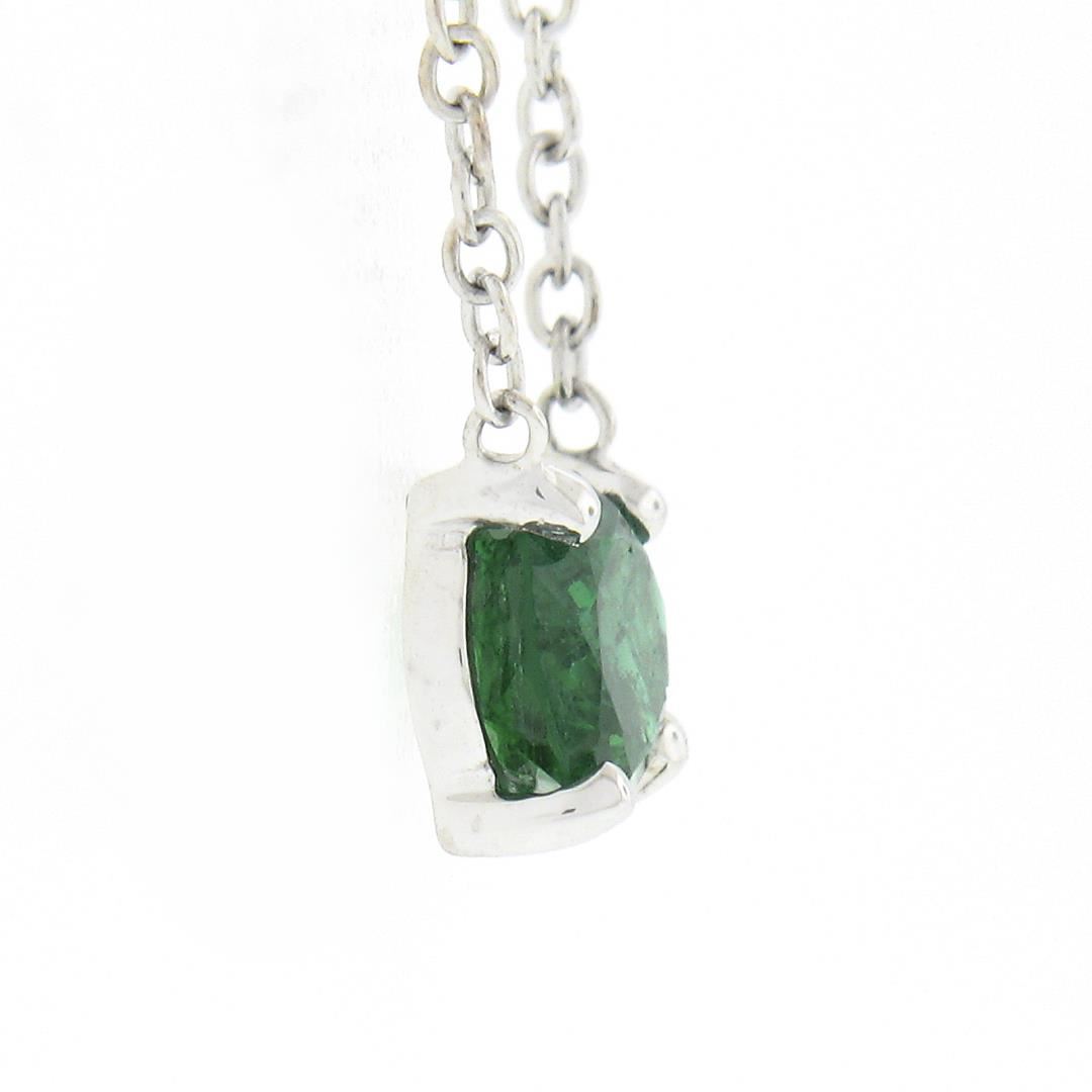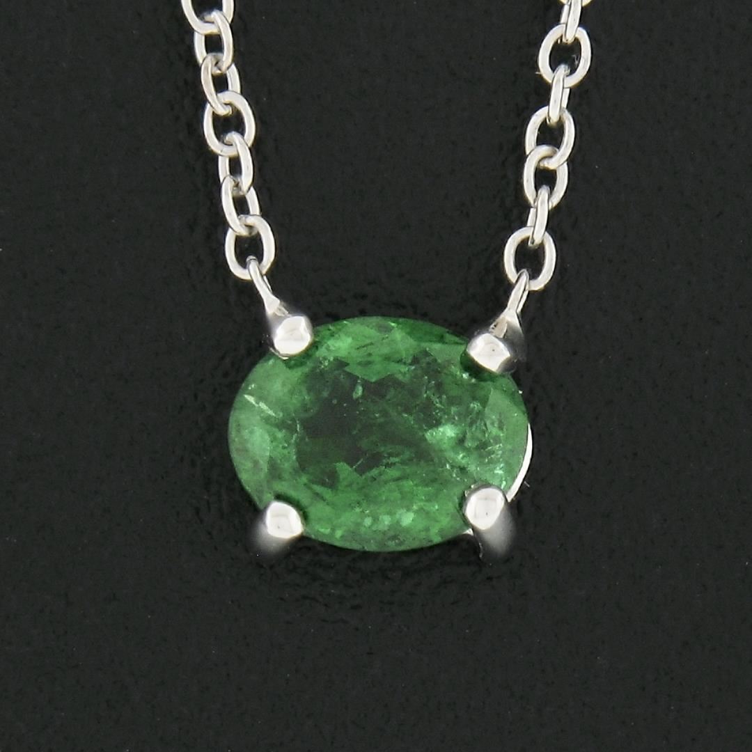A new solid 14k white gold pendant necklace, with 1 oval cut natural emerald (0.43ct). Adjustable at 16 or 18 inch cable link chain, 1.55 grams total weight, pendant measures 4.90x5.8mm.