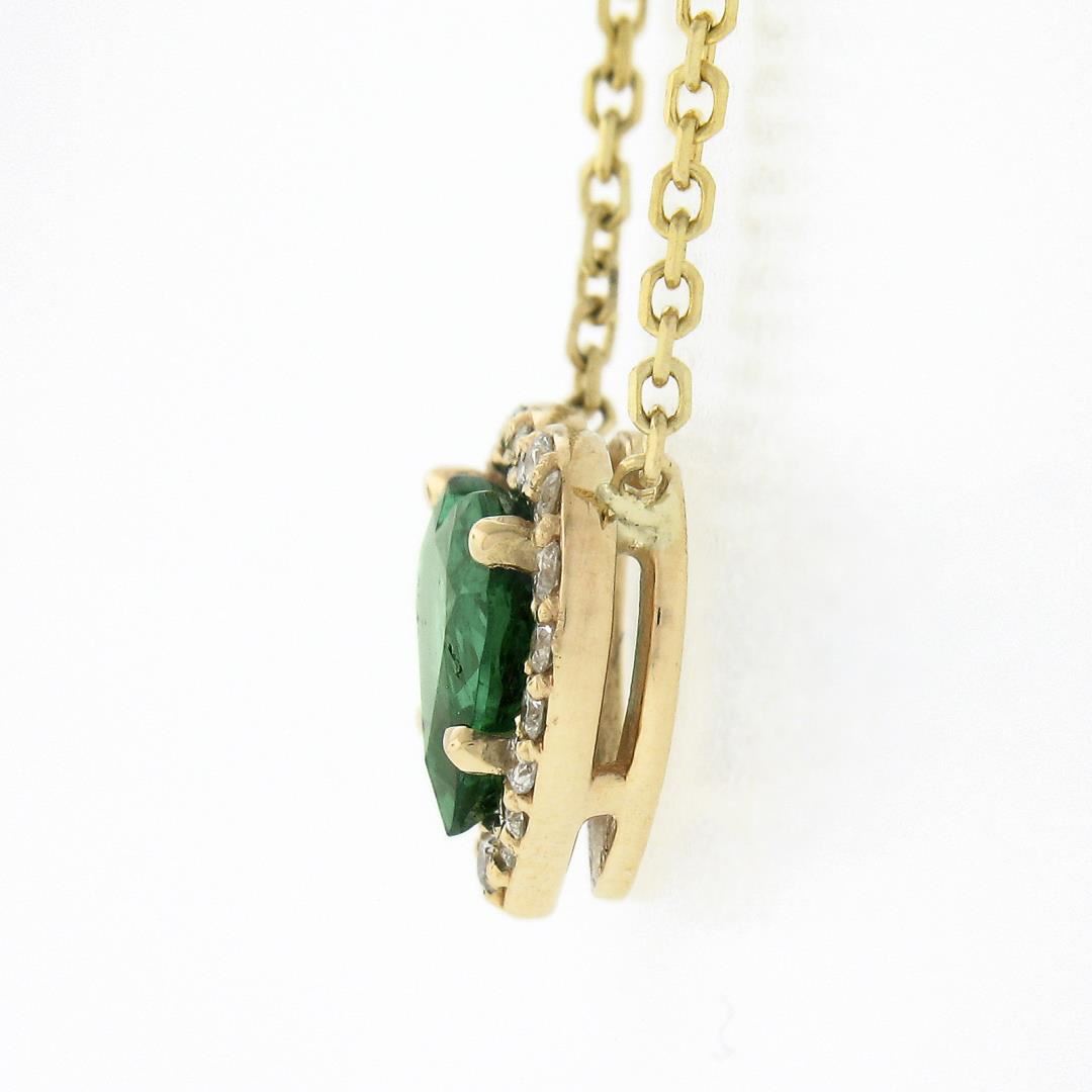 A new solid 14k yellow gold heart pendant necklace, featuring 1 heart brilliant cut natural emerald (0.64ct), with a halo of 19 round brilliant cut natural diamonds (F/G - VS1/VS2 ; 0.11ctw). Adjustable to 16.5, 17.5, & 18.5 inch cable link chain, 2.59 grams total weight, pendant measures 8.95x9.2mm.