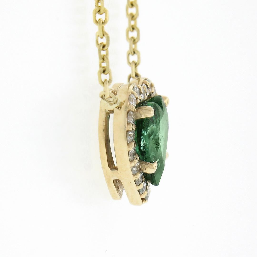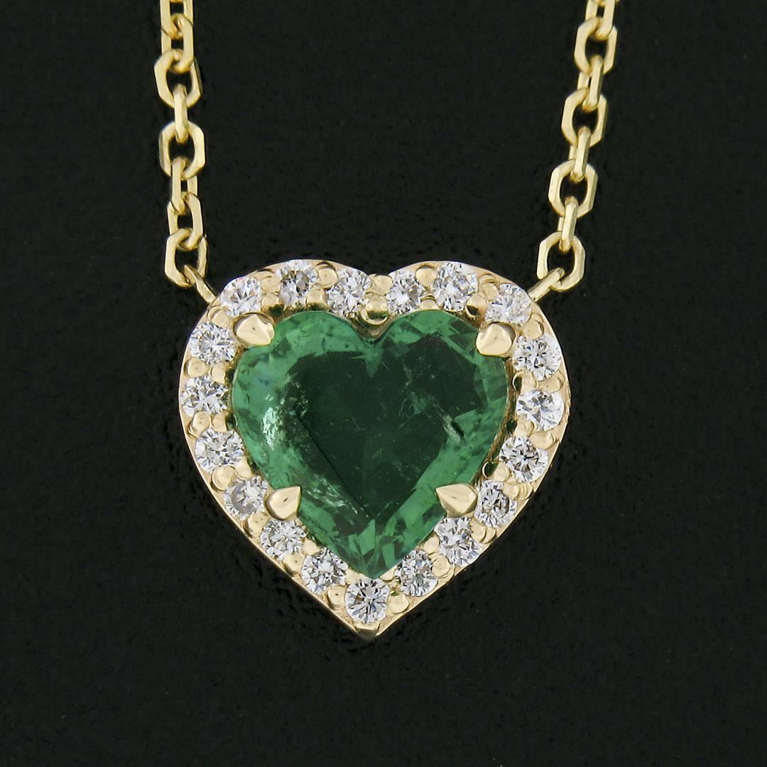 A new solid 14k yellow gold heart pendant necklace, featuring 1 heart brilliant cut natural emerald (0.64ct), with a halo of 19 round brilliant cut natural diamonds (F/G - VS1/VS2 ; 0.11ctw). Adjustable to 16.5, 17.5, & 18.5 inch cable link chain, 2.59 grams total weight, pendant measures 8.95x9.2mm.