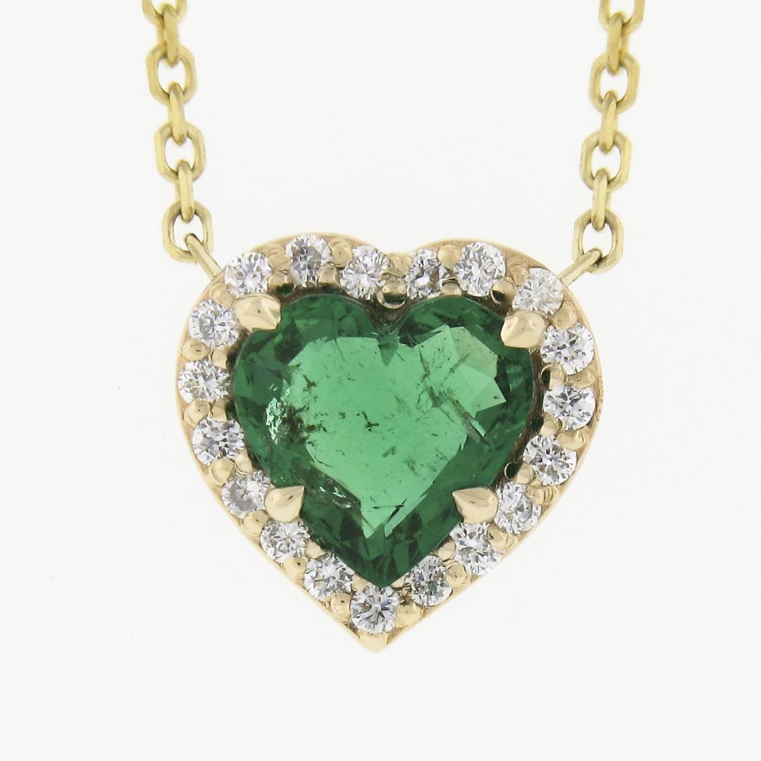 A new solid 14k yellow gold heart pendant necklace, featuring 1 heart brilliant cut natural emerald (0.64ct), with a halo of 19 round brilliant cut natural diamonds (F/G - VS1/VS2 ; 0.11ctw). Adjustable to 16.5, 17.5, & 18.5 inch cable link chain, 2.59 grams total weight, pendant measures 8.95x9.2mm.