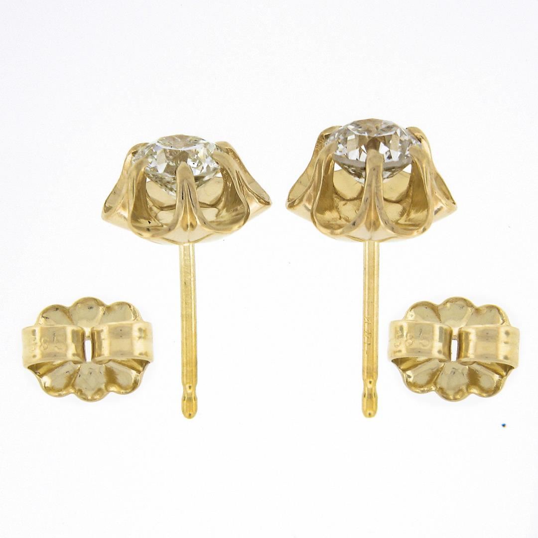 A new solid 14k yellow gold flower stud earrings, featuring 2 old European cu natural diamonds (H/I - VS1/VS2; 0.76ctw). The earrings measure approximately 7.9mm in diameter and weigh a total of 1.57 grams.