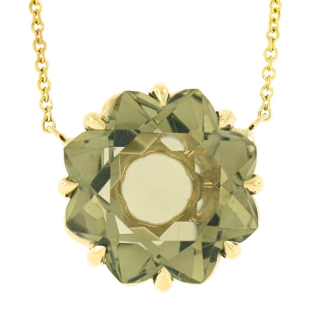 A new solid 14k yellow gold pendant necklace, with star snowflake cut natural smoky quartz (13ctw). Adjustable 17 & 19 inch cable link chain, 9.72 grams total weight, pendant measures 17.7x17.8mm.