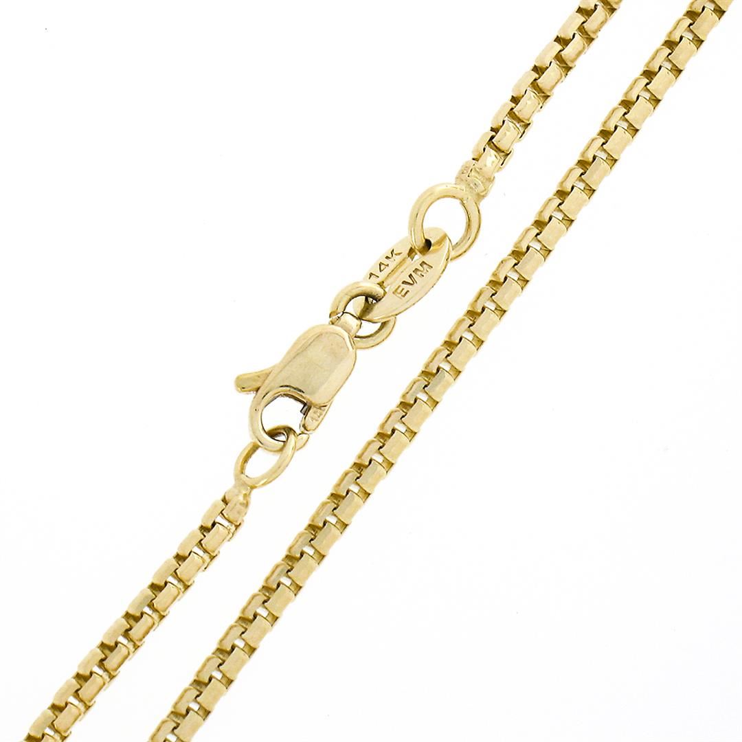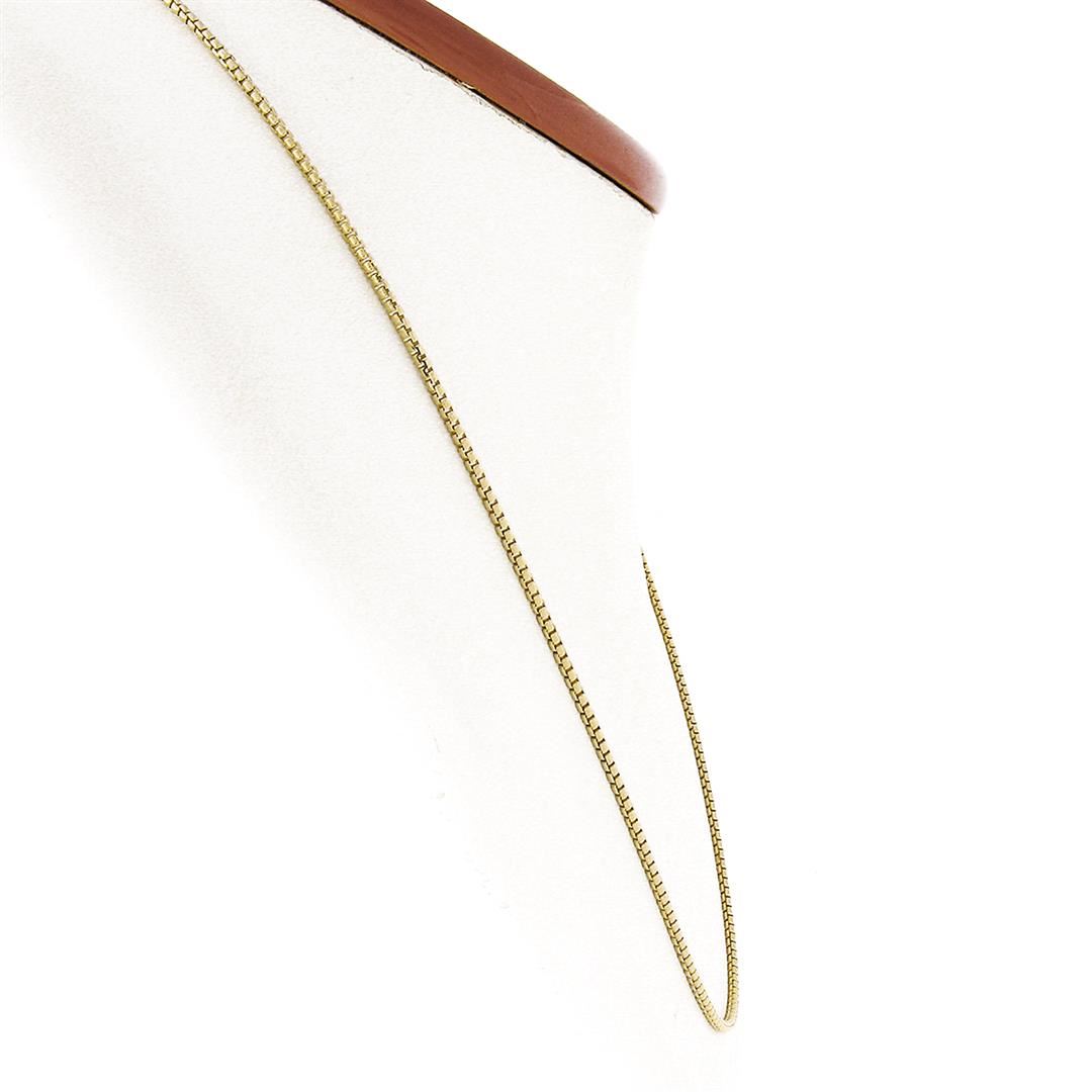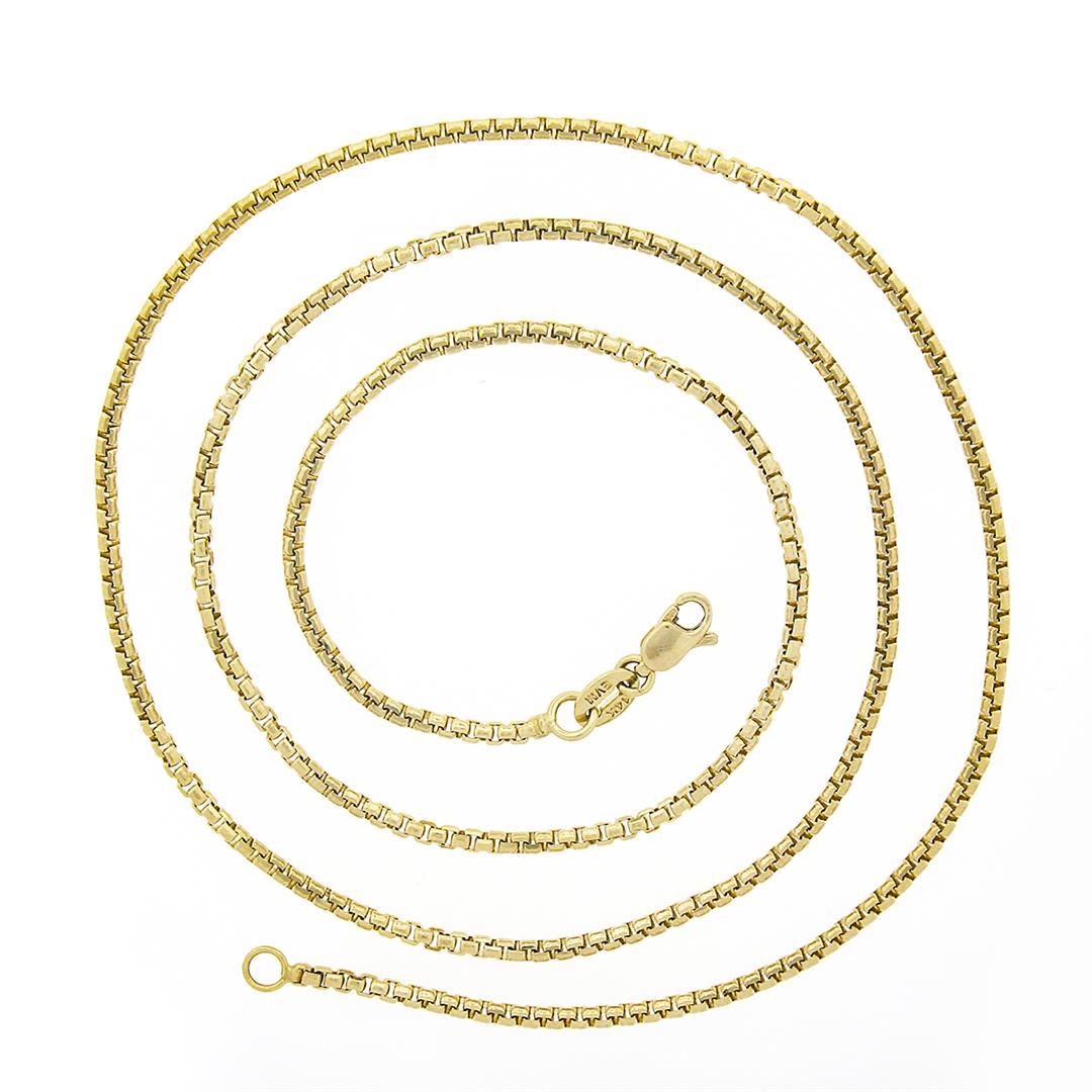 A new solid 14k yellow gold box link chain necklace. It weighs a total of 6.62 grams, measures 1.6mm wide, and measures 18 inches in length.