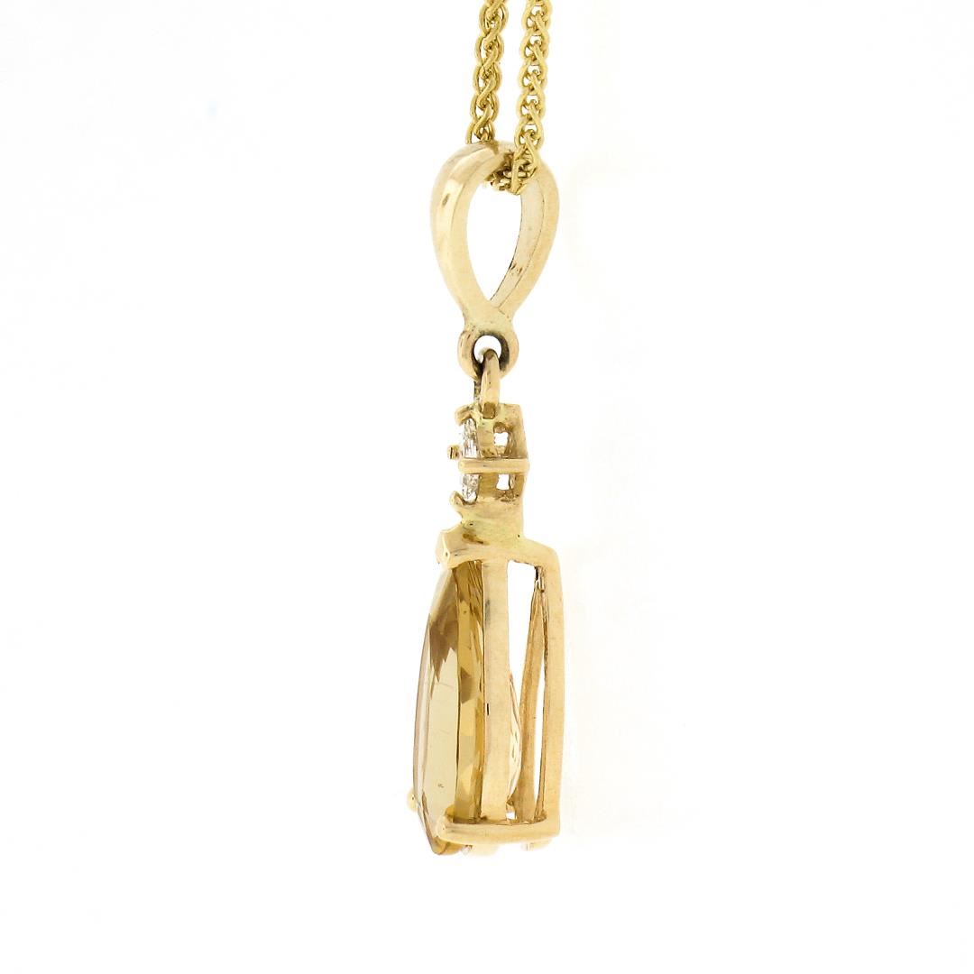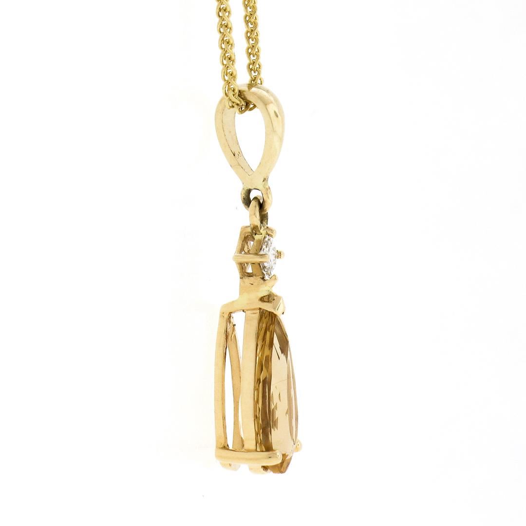 A new solid 14k yellow gold pendant necklace, with 1 pear cut natural imperial topaz (1.50ct), and 1 round brilliant cut natural diamond (F - VS2 ; 0.06ct). 18 inch wheat link chain, 3.27 grams total weight, pendant measures 25x6.60mm.
