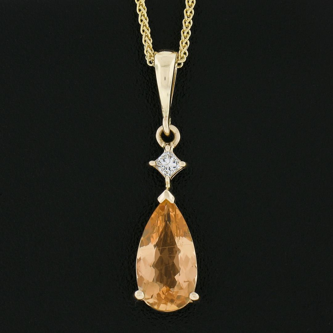 A new solid 14k yellow gold pendant necklace, with 1 pear cut natural imperial topaz (1.50ct), and 1 round brilliant cut natural diamond (F - VS2 ; 0.06ct). 18 inch wheat link chain, 3.27 grams total weight, pendant measures 25x6.60mm.