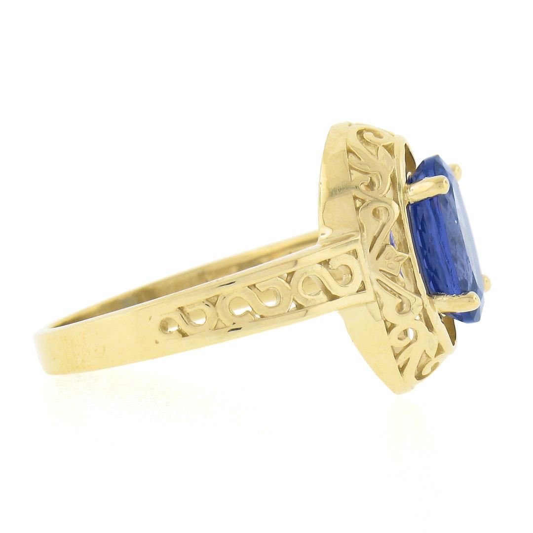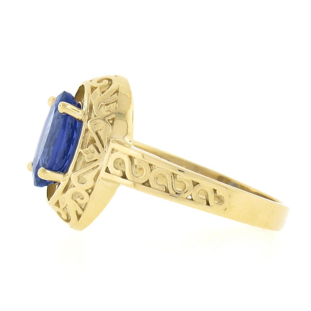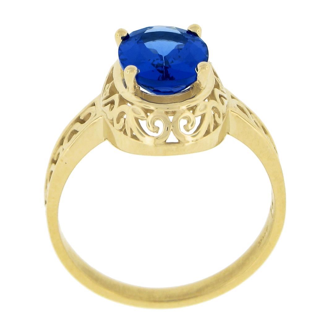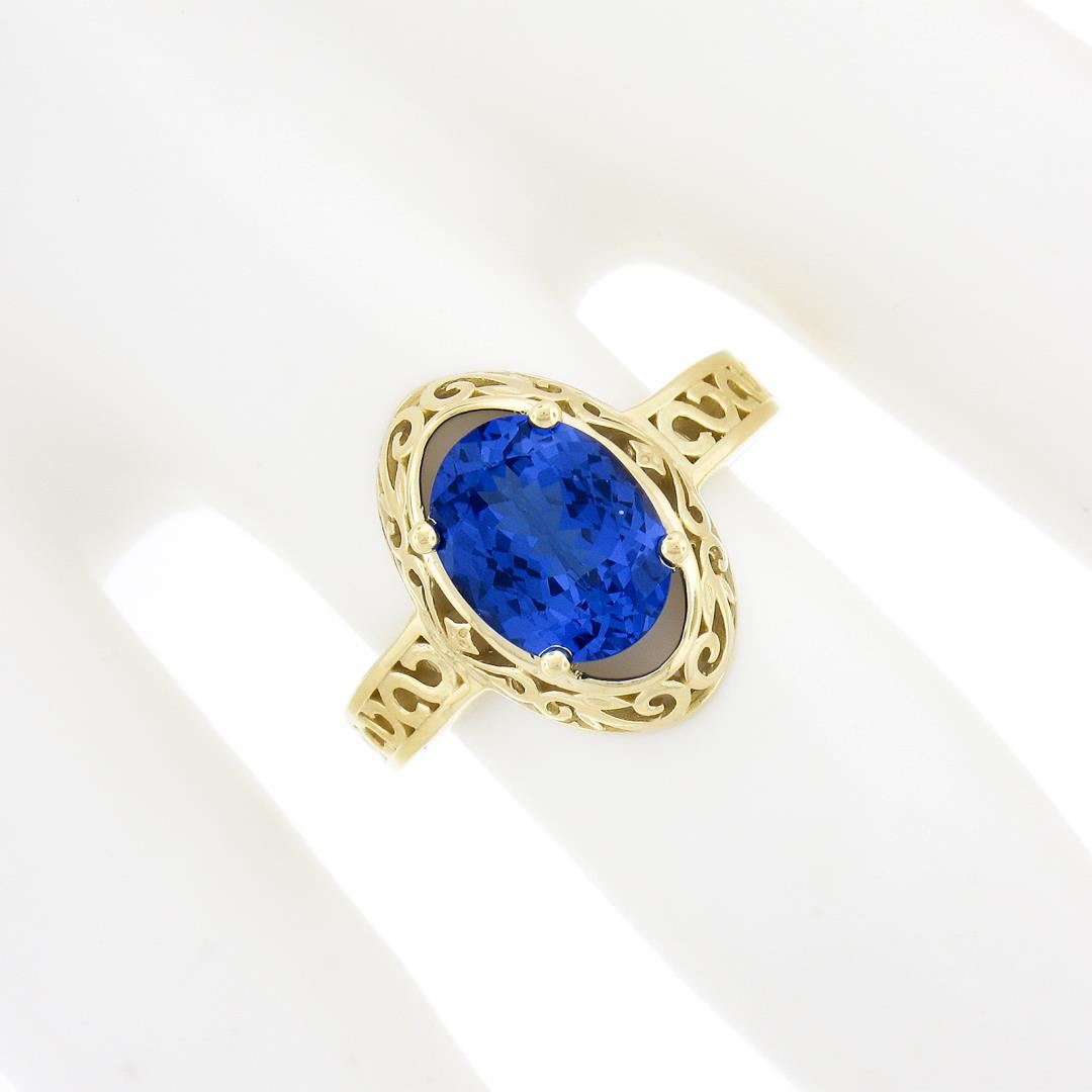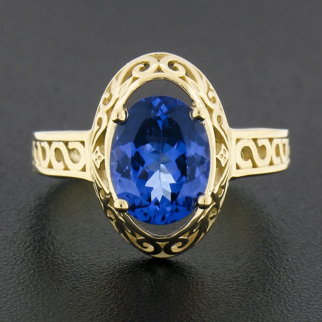 A new solid 14k yellow gold ring, with 1 oval cut natural tanzanite (2.0ct). The ring is size 7.0, weighs a total of 3.60 grams, and measures 14.9mm wide.