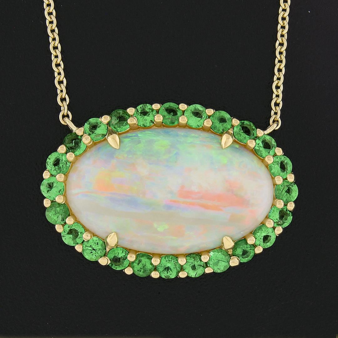 A new solid 14k yellow gold pendant necklace, with 1 GIA graded oval cabochon cut natural opal (5.33ct), surrounded with a halo of 24 round cut natural emeralds (0.98ctw). Adjustable 16.5 and 18.5 inch cable link chain, 6.40 grams total weight, pendant measures 16.7x24.3mm. Comes with all original relevant certifications.