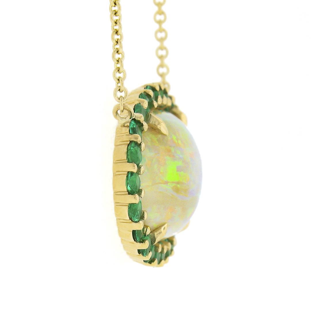 A new solid 14k yellow gold pendant necklace, with 1 GIA graded oval cabochon cut natural opal (5.33ct), surrounded with a halo of 24 round cut natural emeralds (0.98ctw). Adjustable 16.5 and 18.5 inch cable link chain, 6.40 grams total weight, pendant measures 16.7x24.3mm. Comes with all original relevant certifications.