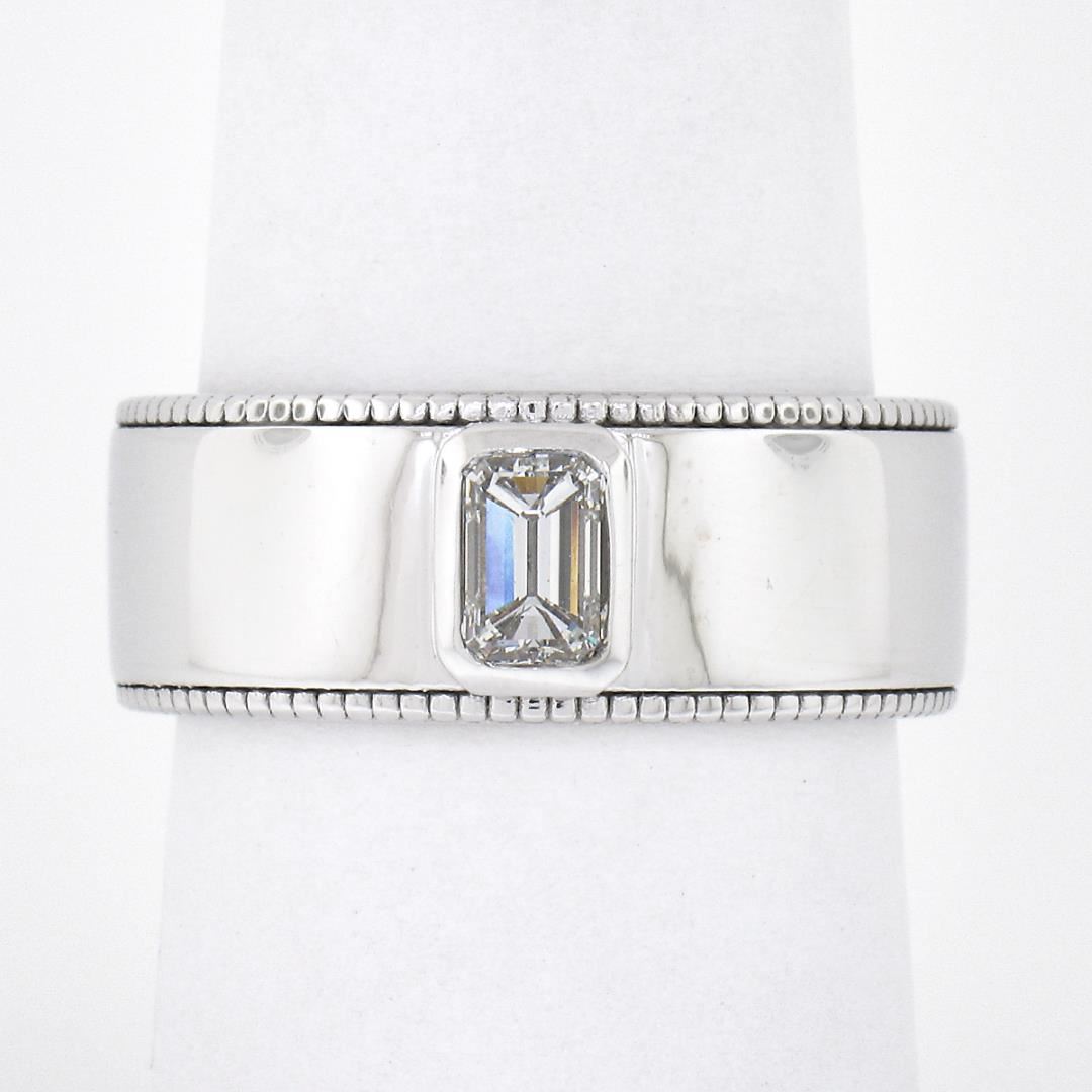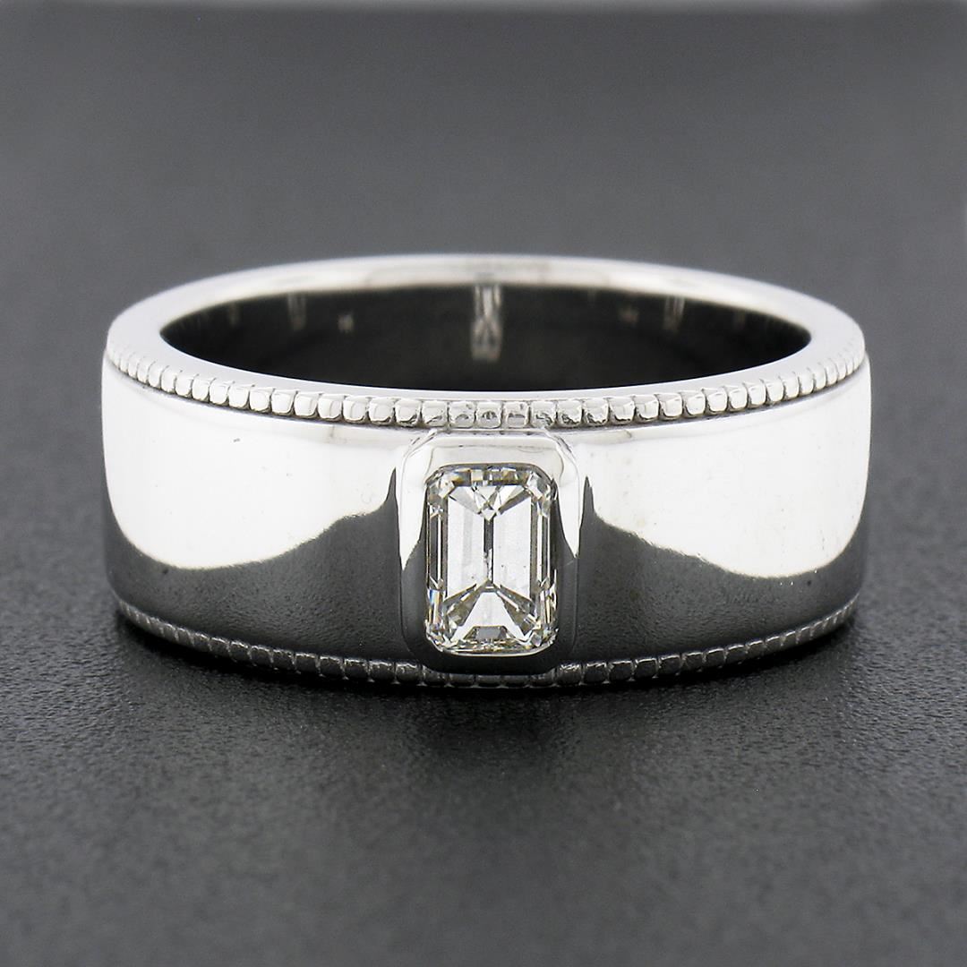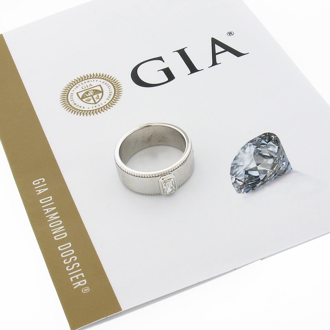 A new solid 14k white gold solitaire band ring, with 1 GIA graded emerald cut natrual diamond (E - VS2 ; 0.53ct). The ring is size 7.0, weighs a total of 10.80 grams, and measures 8mm wide. Comes with all original relevant certifications.