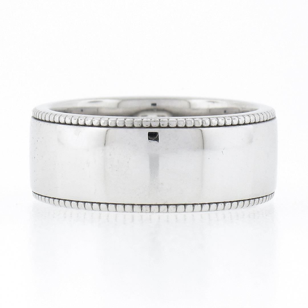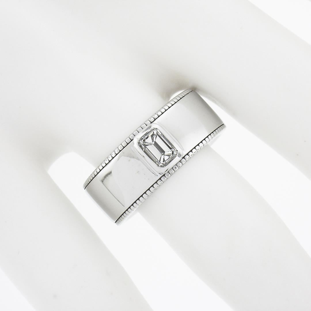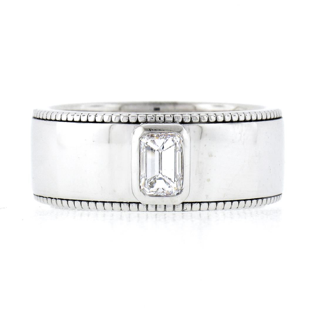 A new solid 14k white gold solitaire band ring, with 1 GIA graded emerald cut natrual diamond (E - VS2 ; 0.53ct). The ring is size 7.0, weighs a total of 10.80 grams, and measures 8mm wide. Comes with all original relevant certifications.