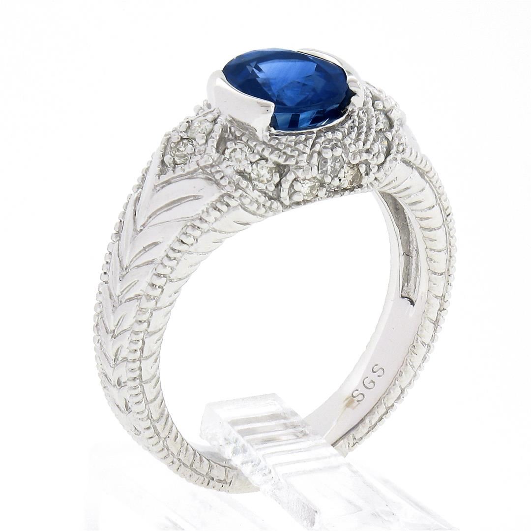 A new solid 14k white godl ring, with 1 GIA graded round natrual sapphire (1.65ct ), and 18 round brilliant cut natural diamonds (F/G - VS2/SI1 ; 0.18ctw. The ring is size 6.5, weighs a total of 6.42 grams, and measures 9.4mm wide. Comes with all original relevant certifications.
