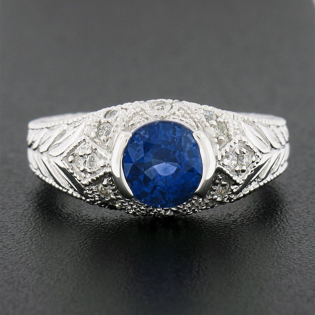 A new solid 14k white godl ring, with 1 GIA graded round natrual sapphire (1.65ct ), and 18 round brilliant cut natural diamonds (F/G - VS2/SI1 ; 0.18ctw. The ring is size 6.5, weighs a total of 6.42 grams, and measures 9.4mm wide. Comes with all original relevant certifications.