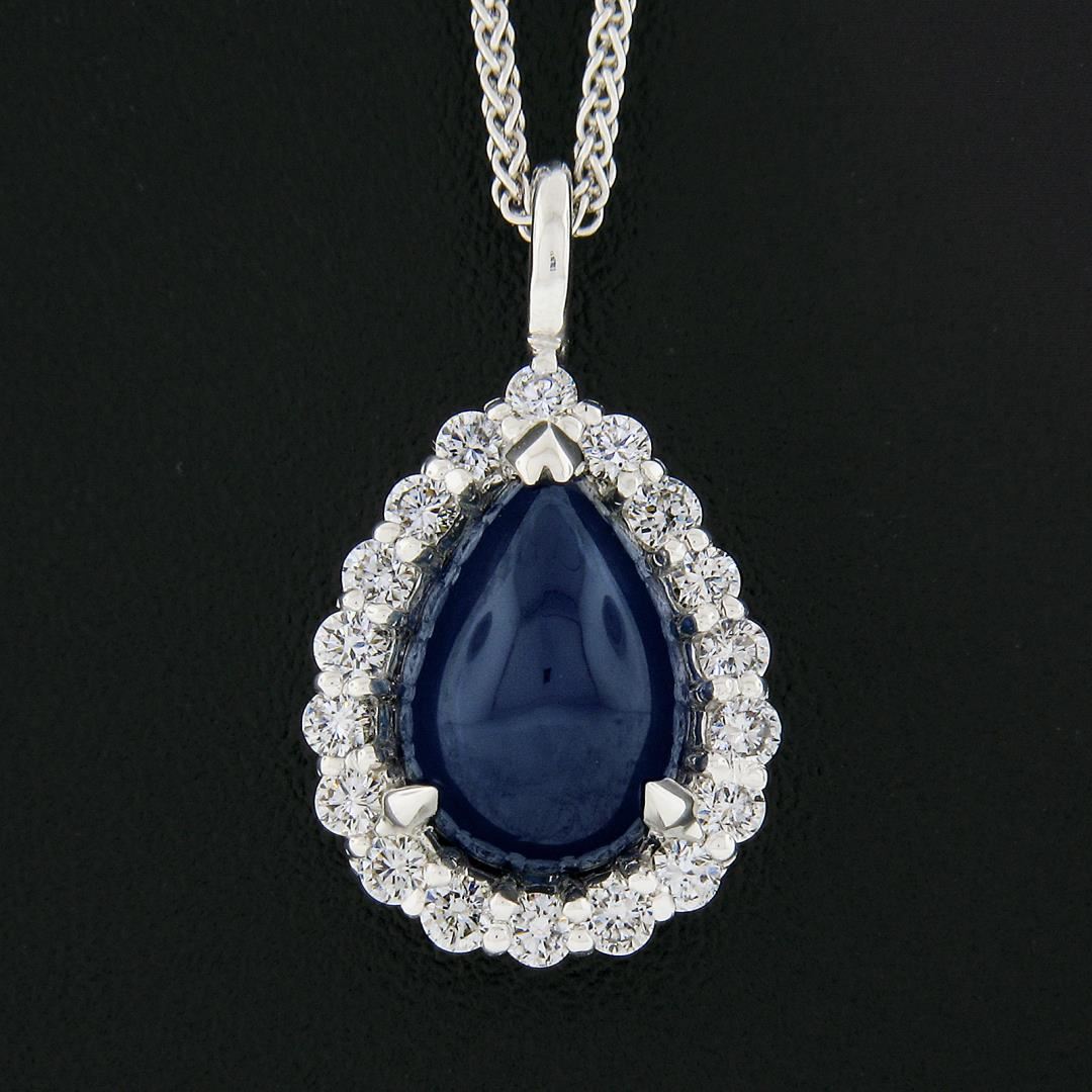 A new solid 14k white gold teardrop pendant necklace, with 1 Gubelin graded pear cabochon cut natural sapphire (3.02ct ), with a halo of 18 round brilliant cut natural diamonds (G/H - VS2/SI1 ; 0.34ctw). 18 inch wheat link chain, 3.90 grams total weight, pendant measures 19x11.10mm. Comes with all original relevant certifications.
