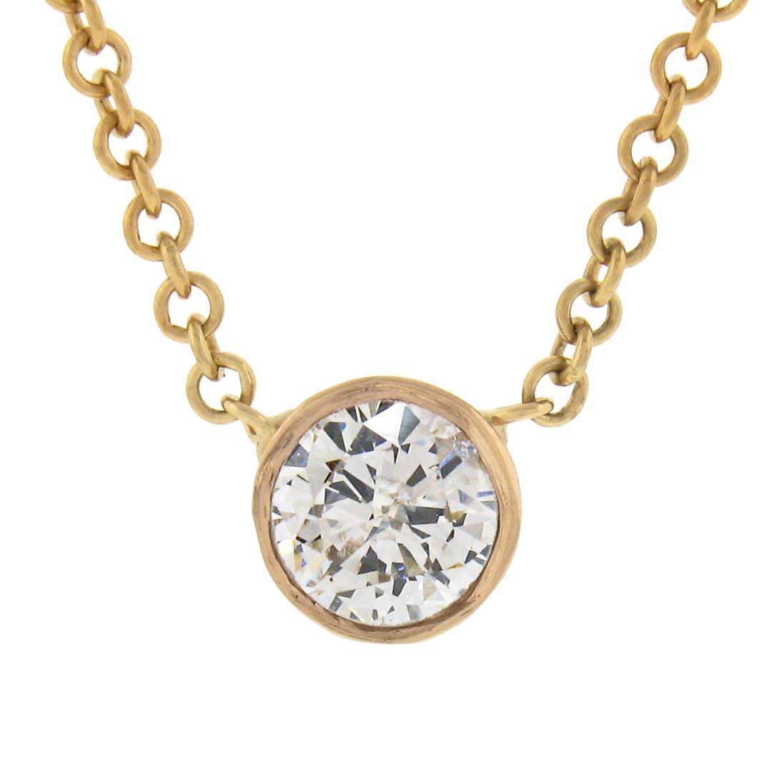 A new solid 14k rose gold solitaire pendant necklace, with 1 round cut natural champagne diamond (I1 ; 0.15ct), Adjustable 16 or 18 inch cable link chain, 1.74 grams total weight, pendant measures 4.3mm in diameter.