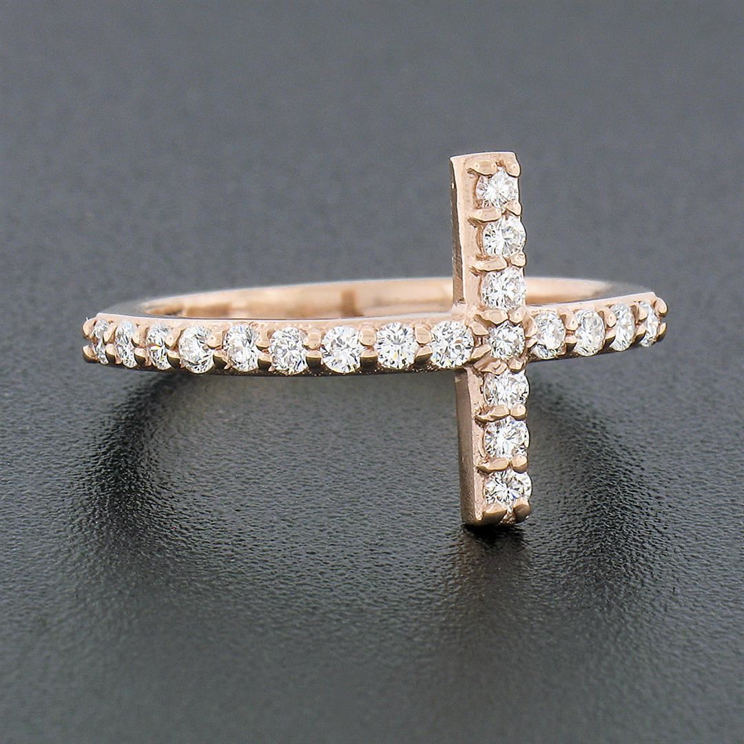 A new solid 14k rose gold cross ring with 20 round brilliant cut natural diamonds (G/H - VS1/VS2 ; 0.40ctw). The ring is size 6.5, weighs a total of 2.65 grams, and measures 13.30mm wide.